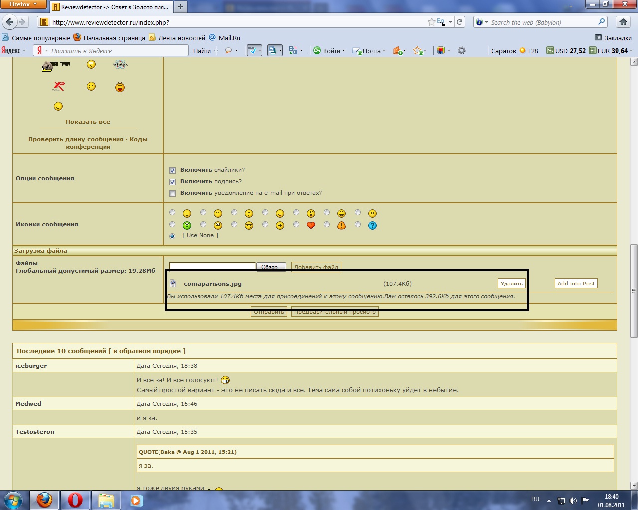 QUOTE(_Arvest_ @ Aug 1 2011, 18:33) Глобальный допустимый размер: 19.87Мб Если выкладывать несколько фото хорошего качества, выполненные профессиональной камерой , согласен с вами. У jeka.piter фотки весят килобайты, attach для них весьма удобен, конечно если он их не сжимал. попробуйте выложить фотку на метр хотя бы. -------------------- Вашими деньгами очень удобно чертить дороги и намазывать икру на хлеб.