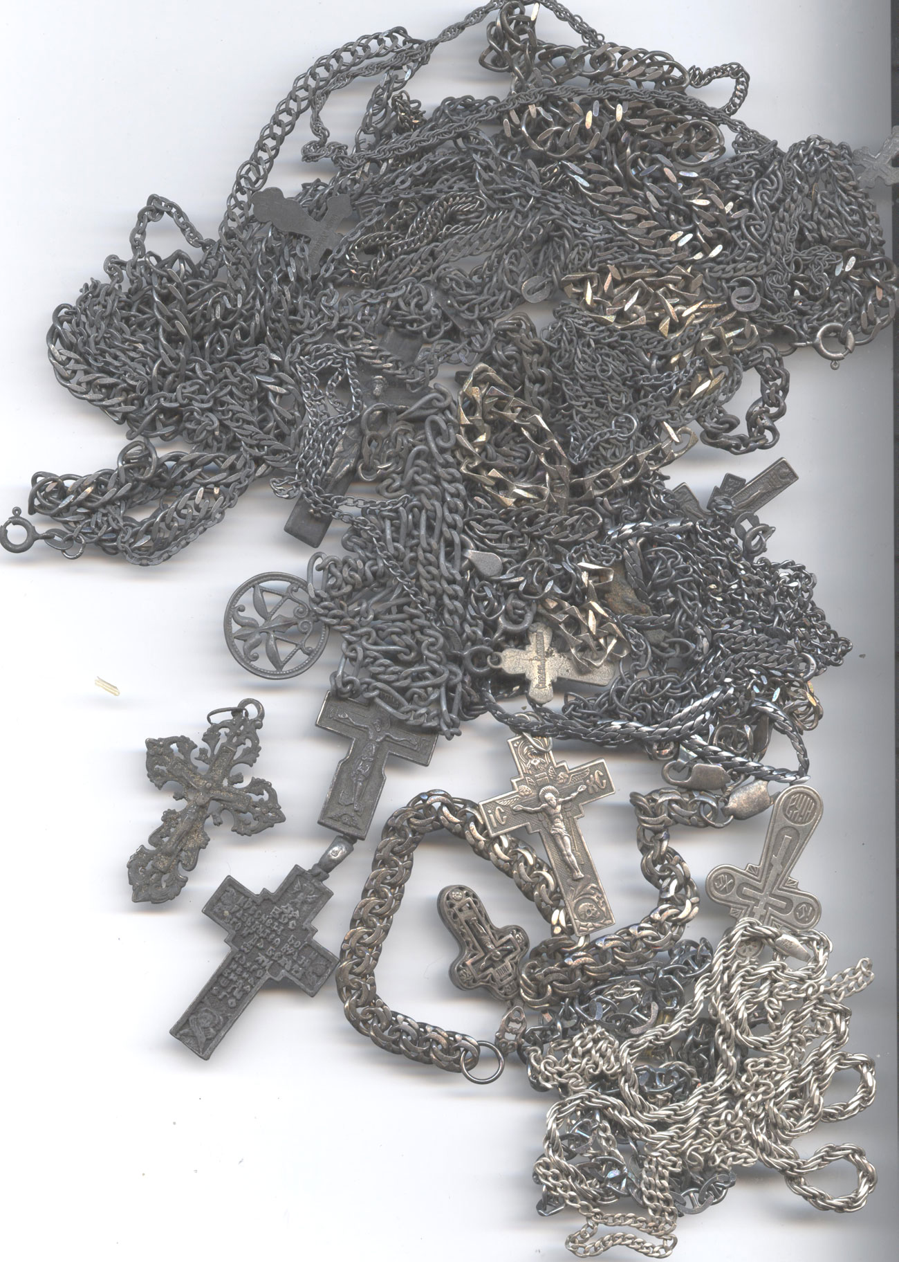 Монетки хорошо чистит лимонная кислота,а вот крестики цепочки как то не очень.