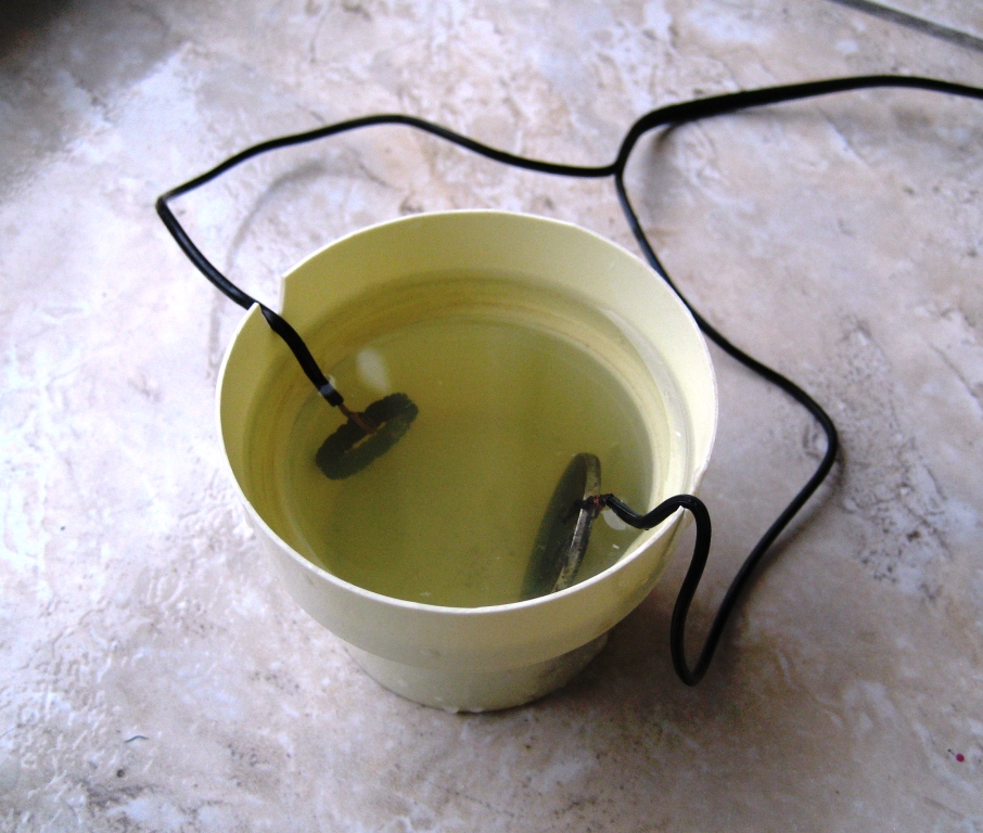 Способ варки с лимонкой,солью, фолгой отмел сразу - кастрюлю жалко! Про электролиз слышал не раз, знакомые таким способом ржавый металл чистят, каски,пряги там разные по войне. На кладтв.ру есть ролик по чистке монет электролизом, в общем знания есть, а попробовать руки не доходили. По совету Алексея (МАН), достал из закромов зарядку, отрезал все не нужное, "крокодилов" нет, так что один провод накрутил на шайбу из нержавейки, другой вокруг кольца, вырезал из пластикового стаканчика емкость, насыпал соли, налил воды, размешал, опустил и включил! Переключил правильно +и-, включил на 12V, но почему-то реакция была слабая, уменьшил до 9V, потом до 5-и и дело пошло, через минуты три вынул и почистил зубной пастой, осталось немного налета, сунул в электролиз еще на несколько минут и опять потер пастой, налета как небывало! Это при том, что патина, даже можно сказать толстый нарост патины был не убиваемый - я эти кольца до этого сутки держал в лимонке и вообще ничего не отчистилось, а тут несколько минут и полный порядок! В общем способ мне поправился. Вложенные эскизы изображений -------------------- Omnia transeunt et id transibit quoque.