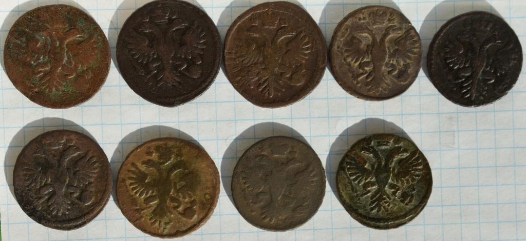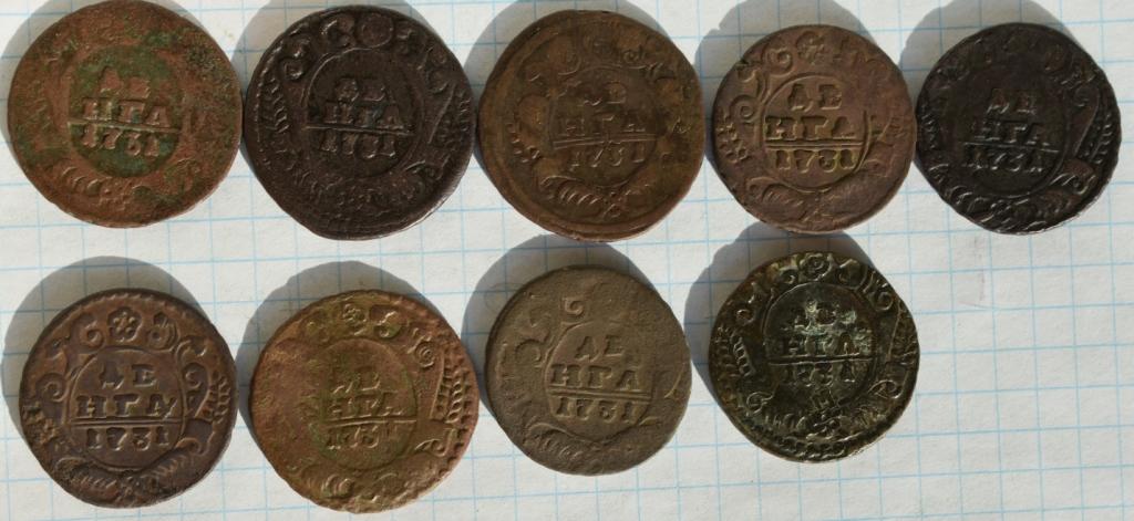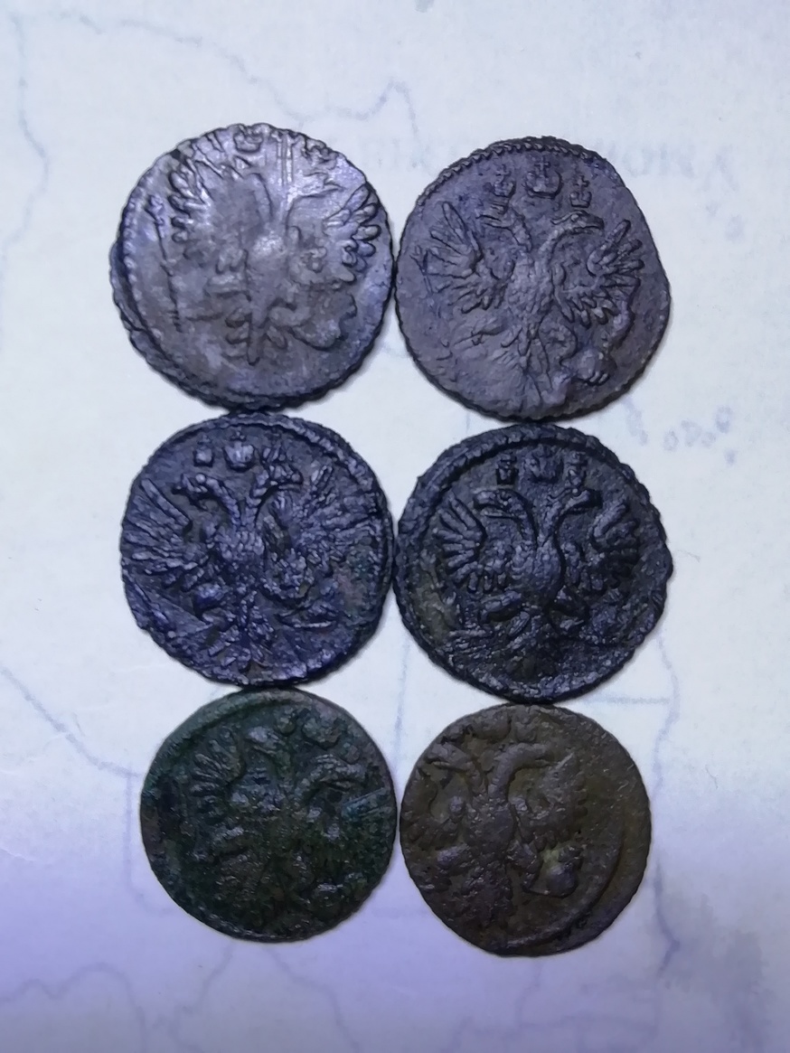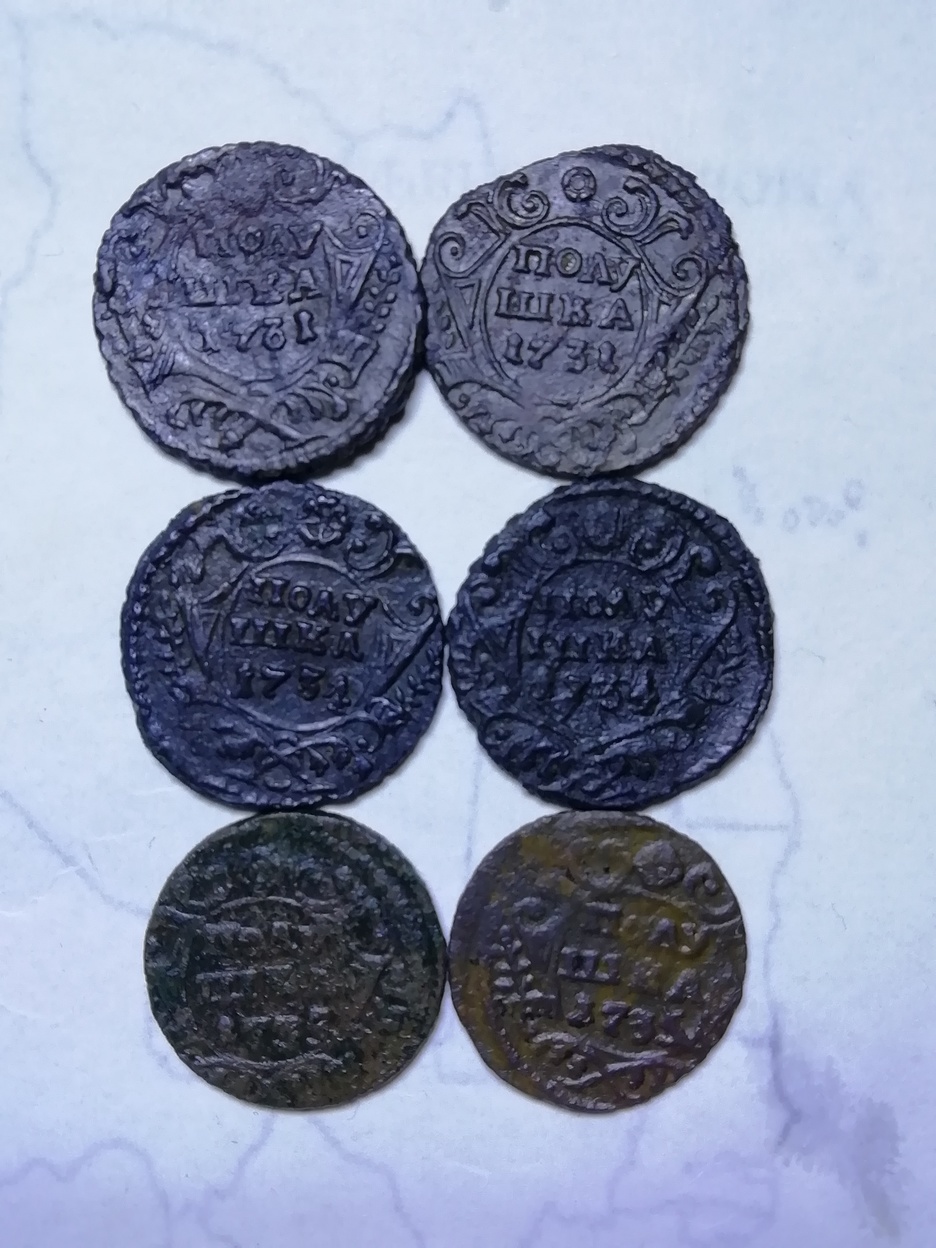 Подскажите пожалуйста по монеткам, будет интерес и примерно стоимость. 1) полушка 1731 перечекан с крестовой и с 1730 ? 2) полушка 1746 3) денга 1741 4) денга 1737 5) денга 1751 6) денга 1752 7) денга 1731 перечекан с петровской -------------------- Местный