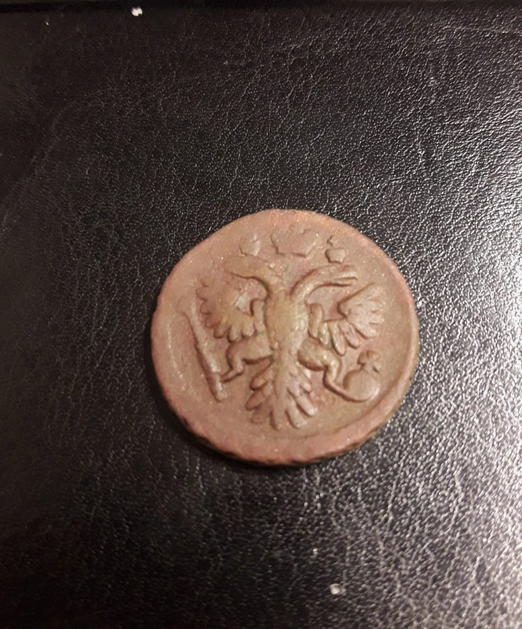 Доброго времени. подскажите пожалуйста по данному перечекану. то ли двойной удар, то ли перечекан с другой денги. но смущает размер монеты, уж больно большой диаметр 27мм, да и вес монеты 8.50гр. по весу подходит копейка Петра 1. могу конечно ошибаться. монета не чистилась, помыта только водой. со стороны орла зацепил лопатой на 9 часов. гурт просматривается только на не большом участке. на 2-х нижних фото пример обычной деньги для сравнения. за раннее спасибо всем ответившим.