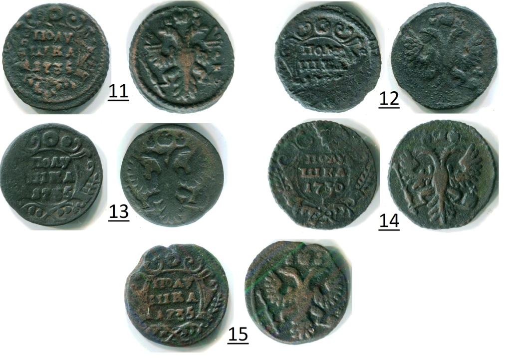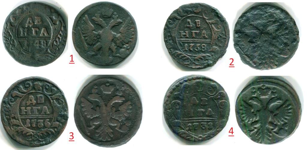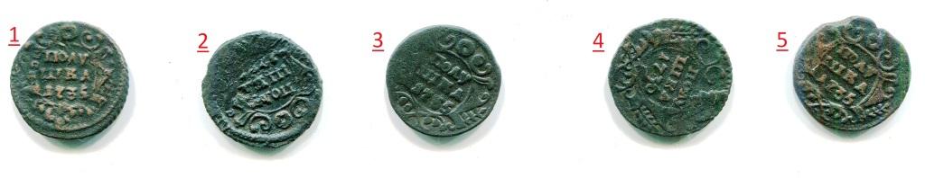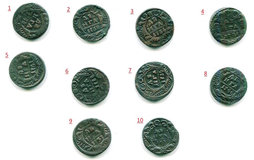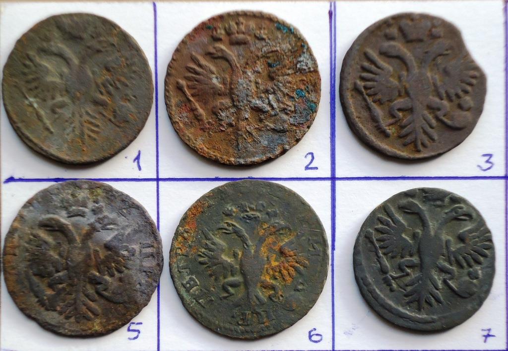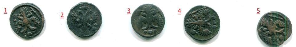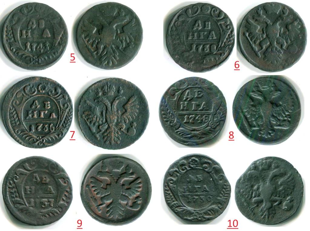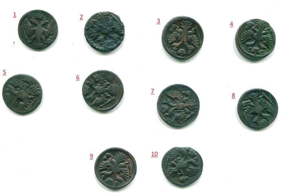Номер один ,деньга 1730 пореже(четыре пера в хвосте),номер 2 тоже реже встречается (одна черта),но состояние оставляет желать лучшего, по крайней мере я так по этим фото вижу. Номер 5 красивый перечекан,на любителя. Остальные простые по цене не скажу,так кто сколько даст.