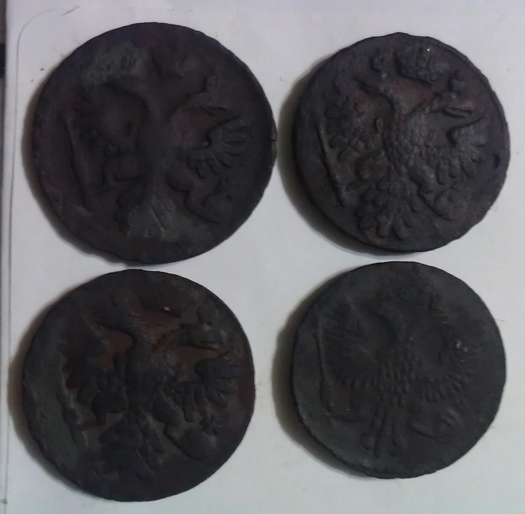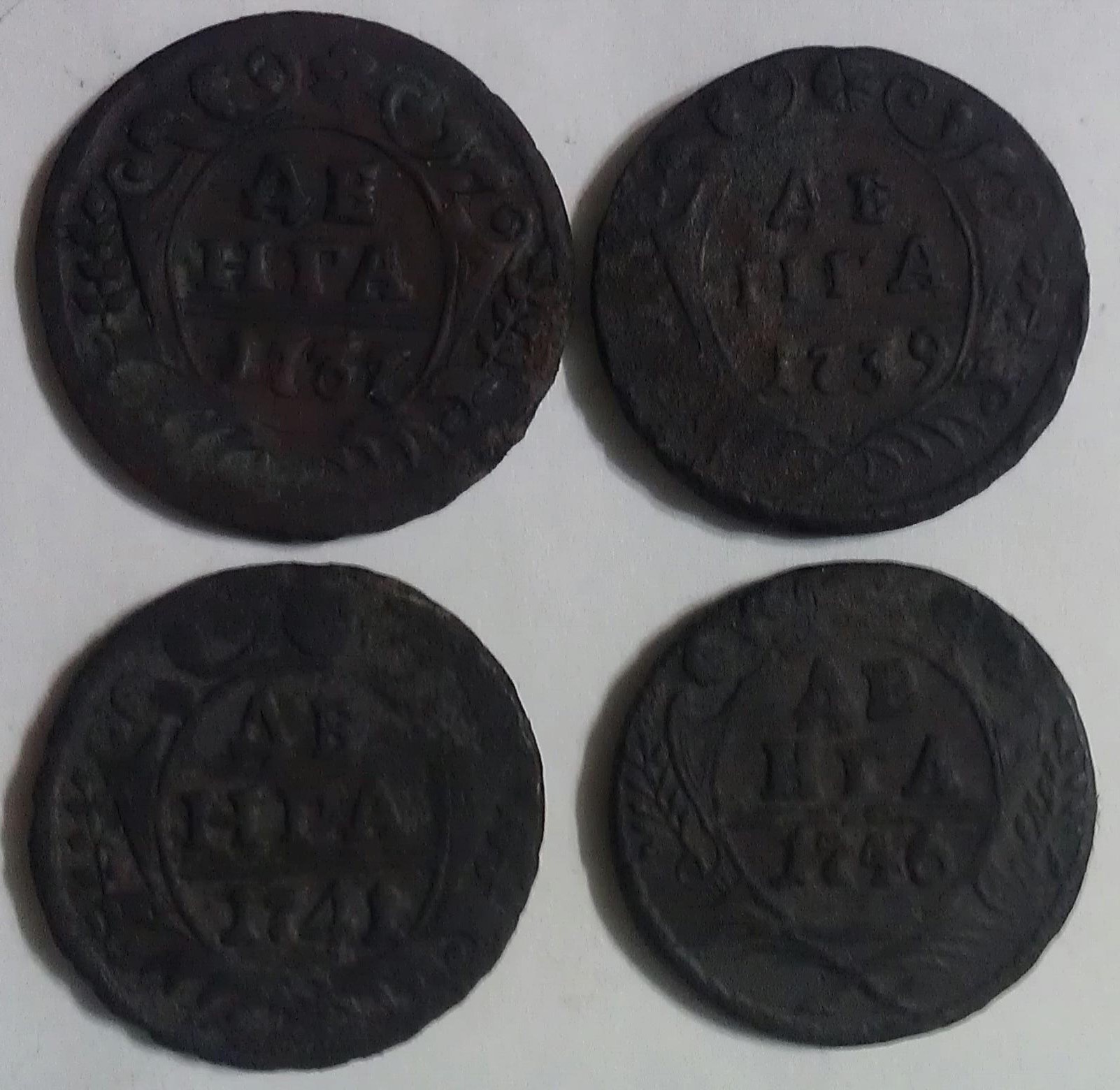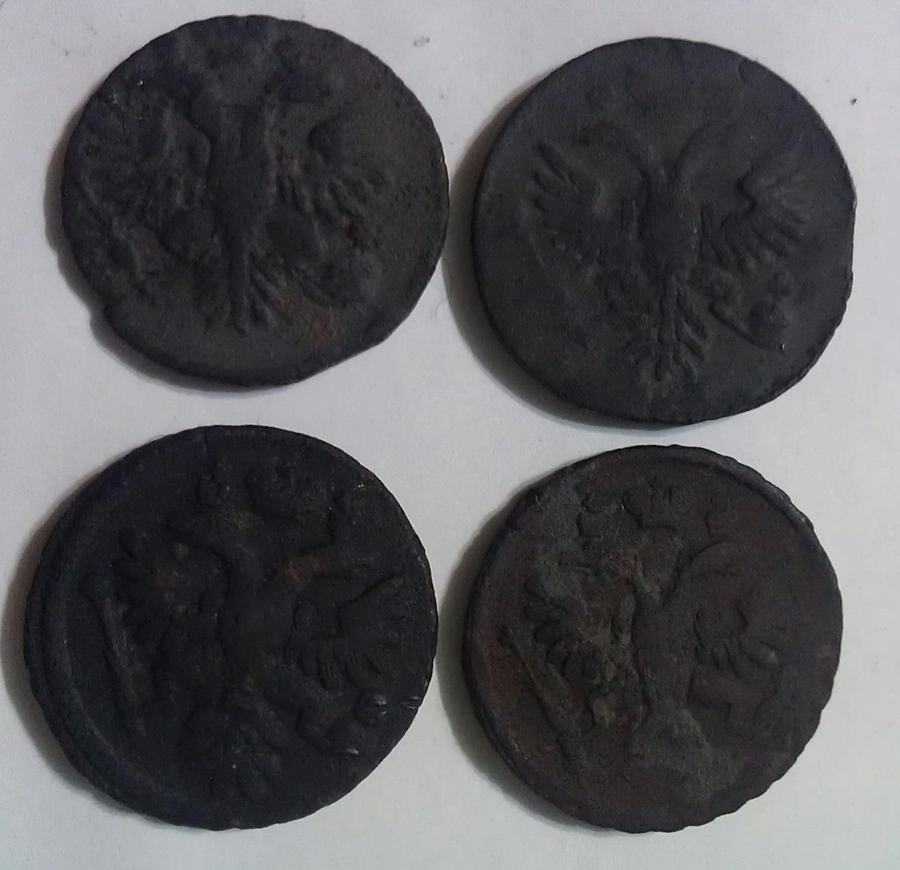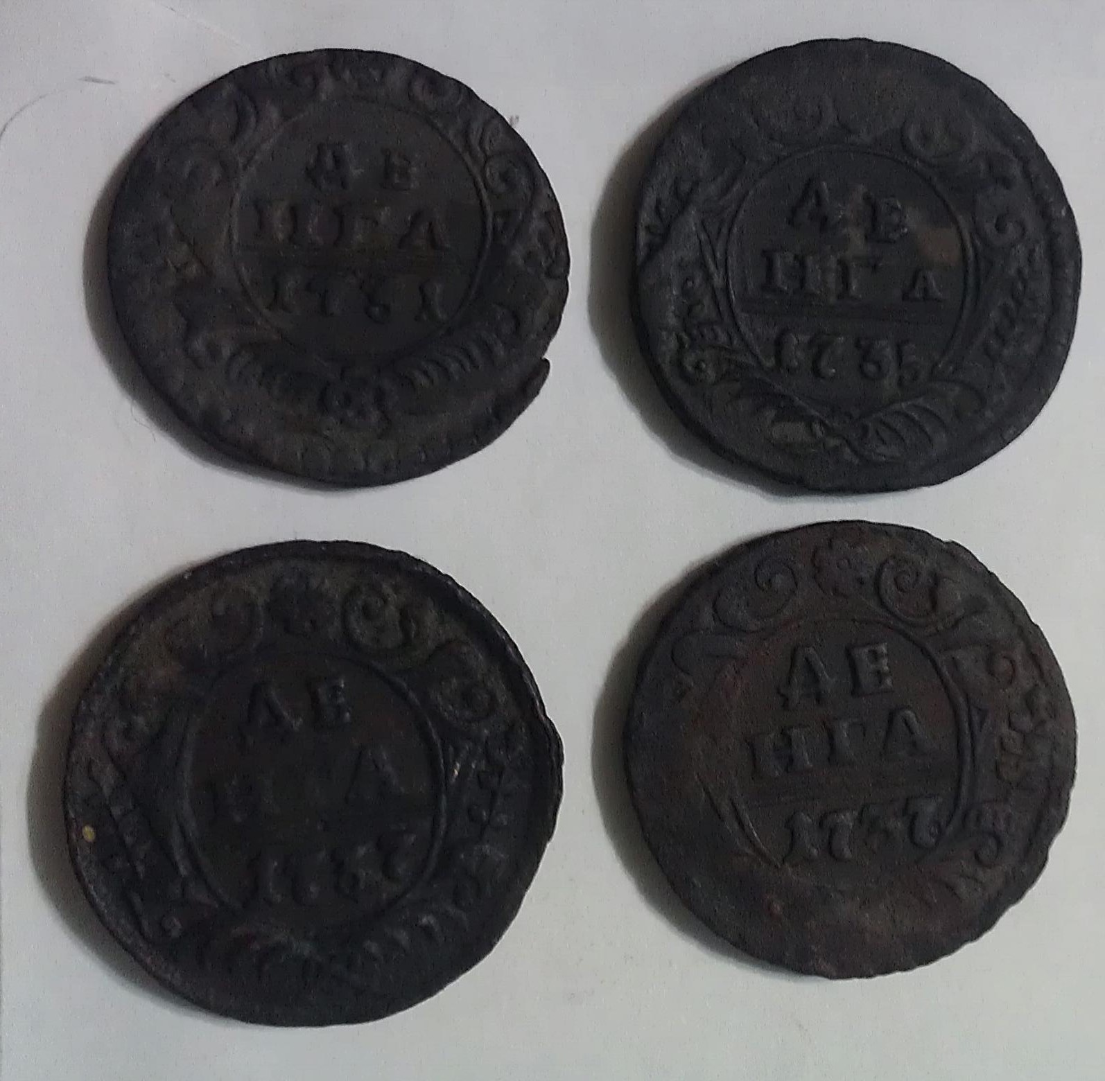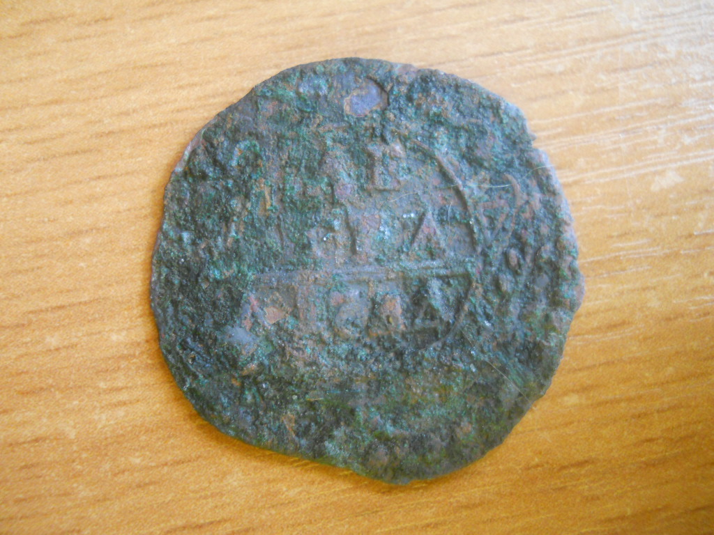 QUOTE(Андрефт @ Sep 27 2014, 20:24) С петровской не похожа, от чего полоса такая ровная полоса?копьё? Рамочная тоже вроде не то, рамка посередине? Может лицевая сторона ДЕНЬГИ. Может у кого еще есть мнения? Это следы холостого соударения штемпелей - полоски над годом. |