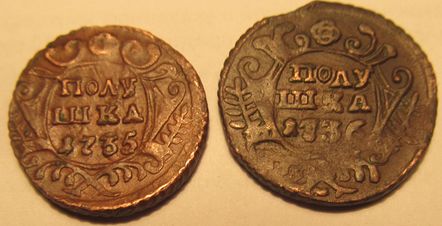 2) Полушка 1735 года, монеты не чищены помыты водой и щеткой из песка!! С у.в !!!