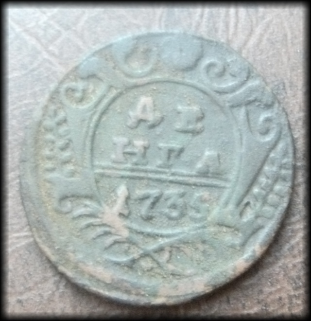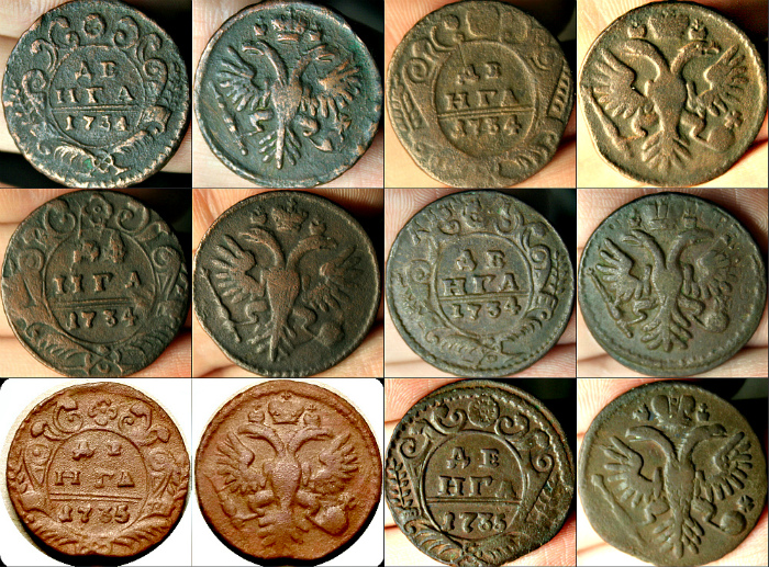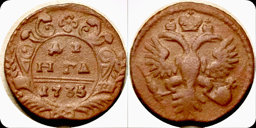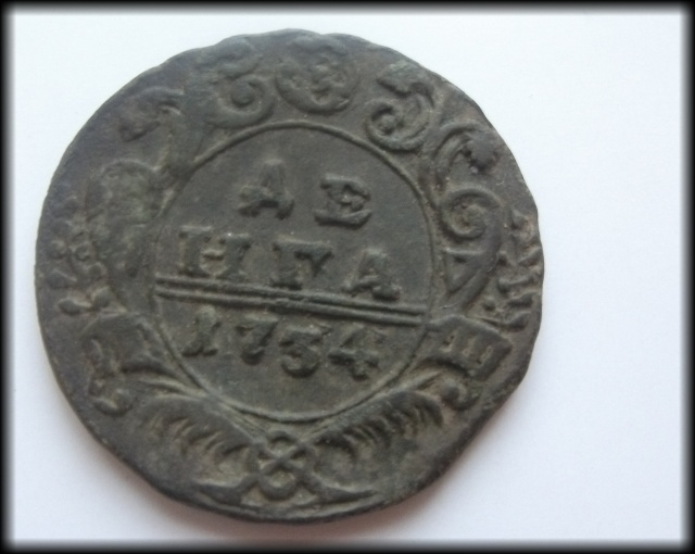 Вот такая денга№-3 по Руководству - аверс: орёл образца 1734г., девять перьев в одном крыле и десять в другом, хвост орла - по три ряда перьев с каждой стороны, крест державы простой