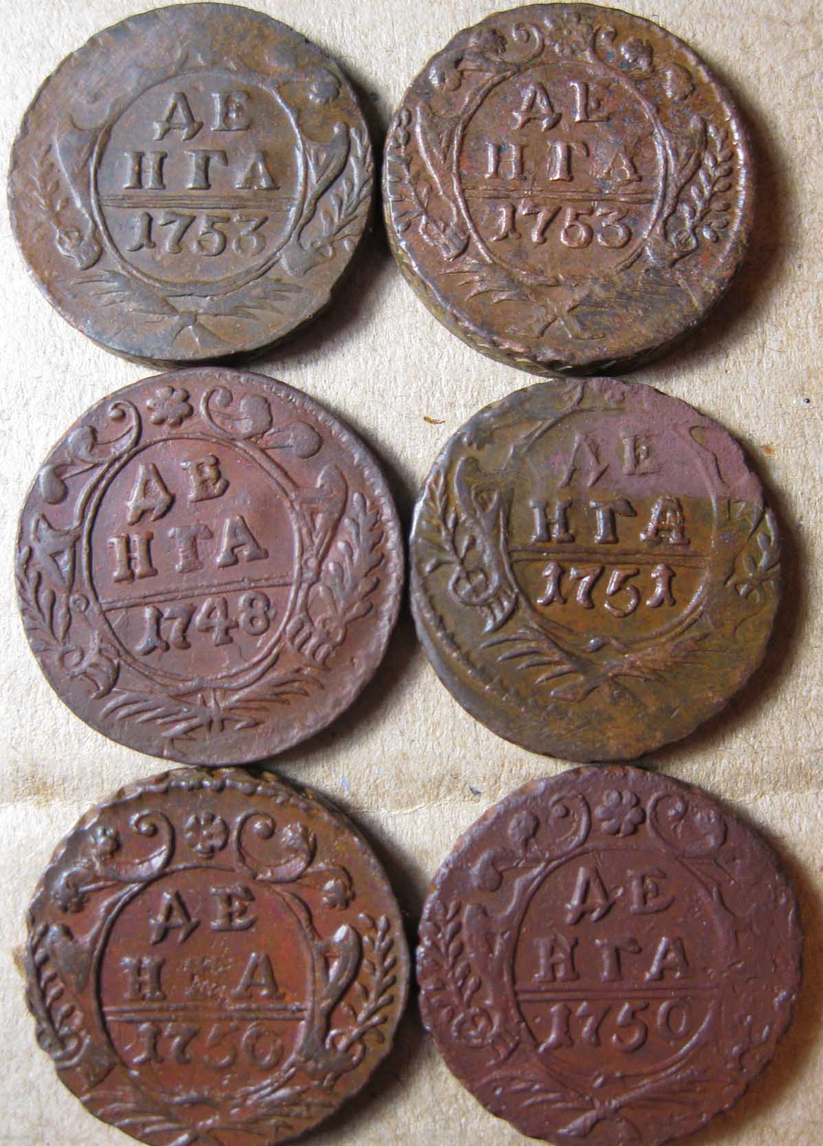 ну и последний : в 1753-м денга пошла только Московская, в Е-бурге к тому времени мон.двор прикрыли, а штемпеля притащили все в Москву. вот и шлёпали и 15-тикрылыми и типичными екатеринбургскими штемпелями. для сравнения на фото характерные штемпели из 1748, 1751 и 1750 годов ( кстати розетки 50-го тоже мало разные, цветочки по иному набиты заготовками)