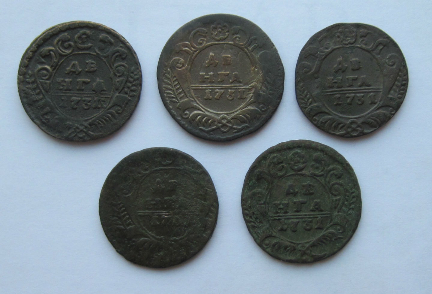 Подскажите по денгам.Первая 1731 с одной чертой,но в орлах не разбираюсь,может тоже есть какая то разновидность?И по цене,если можно.
