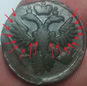 QUOTE(Kalandra @ Mar 20 2017, 15:26) добрый день уважаемые форумчане прошу подсказать большая ли розетка или малая ? полушка 1730 Подлинная полушка 1736 года московская с обычной четырехлепестковой розеткой, а что кажется что 0 а не 6 - так это выкрошка и причуды корозии... |