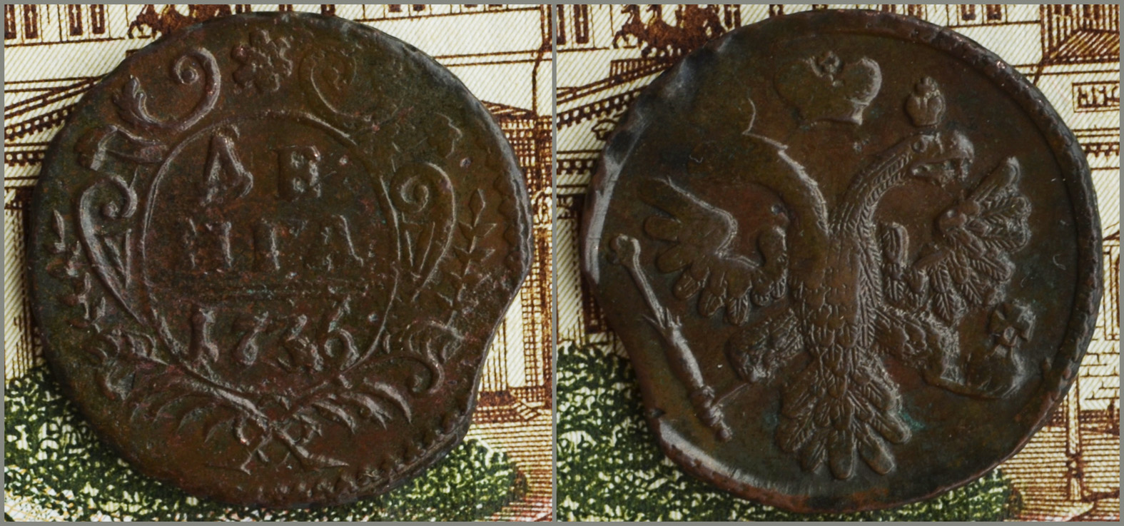 QUOTE(vidavidovich @ Aug 21 2017, 23:21) Всем читающим привет. Подскажите по денге 1743 (чекан вроде 1738), в крыле 6 перьев, правая голова орла чуть склонена, гурт сетчатый, состояние великолепное, поднял в песочке, в июле 2017. Стоит ли выставлять на аукцион и примерная стоимость. Спасибо. Орёл образца 1737г. по восемь перьев в крыле, самый встречаемый для денги 1743г., розетку не могу рассмотреть фото плохое. |