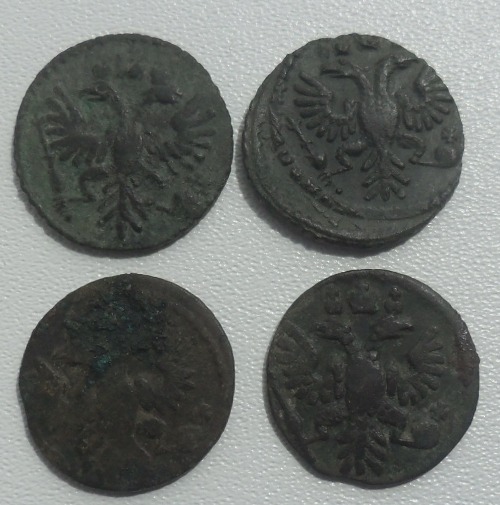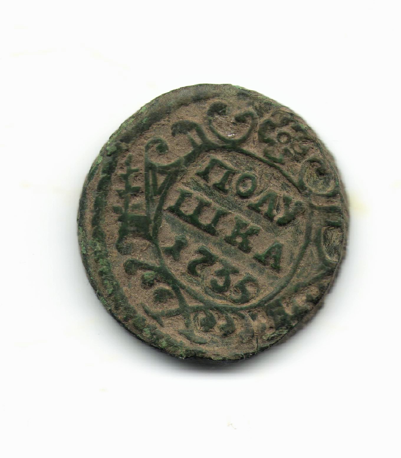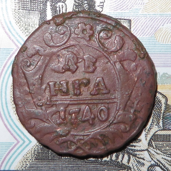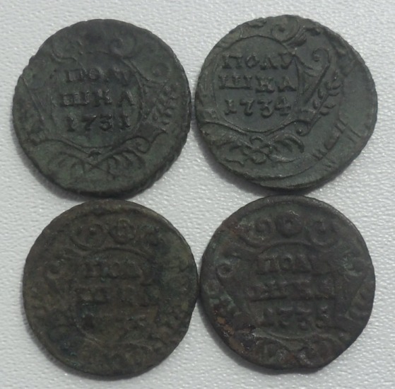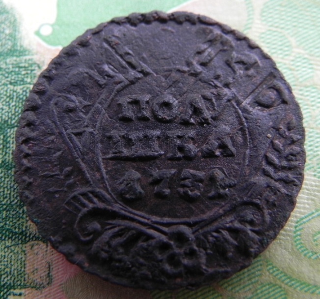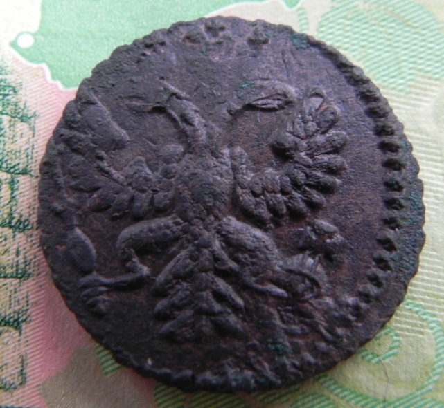 Здравствуйте, у товарища имеются вот такая монетка, денга 1731."пьяный орёл" №66 по руководству ЦФН. монета встречается редко, монета ни чем не чищена, в углублениях даже земля не отмыта.