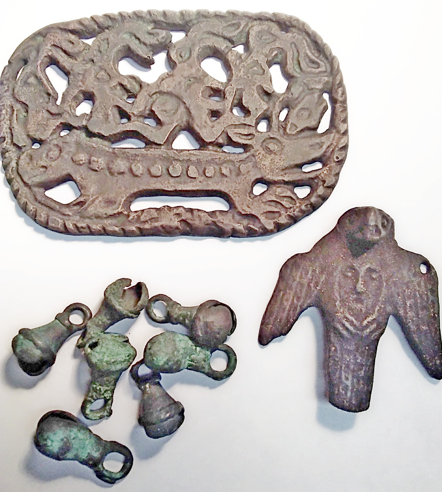 Лет 10 назад, была небольшая вспышка такого материала. Не редко предлогали в антикварный клубах городов Урала, на ярмарках и др местах. Иногда при этом, среди подобного, были в лотах и нормальные правильные предметы (чтоб как то разбавить откровенные левые предметы). Так же среди предметов данного творчества, были не редки копии с музейных экспозиции. Видимо доступ и выход есть туда. При впаривании этих вещей, какие только сказки красочные не рассказывали, то в горах нашли, то где то в дикой тайге и т.п. Лично для меня тут все ясно и однозначно. Ну привески скорее да нормальные. А птица прямо кричит, я левая!!! Такая же чёрная и с проблесками яркого красного металла. Не смотря на волнистую обороту. С такими оборотками так же раньше экземпляры были. Склоняюсь так же, что пластина с человеколосями, сделана с указанного экземпляра из коллекции Зеликмана. Обратите внимание на исполнение участка, где на подлинике недолив, в нижней части. Извините, но творческим людям данного производства думаю можно сказать - "СКУЧНО ДЕВОЧКИ"... |
