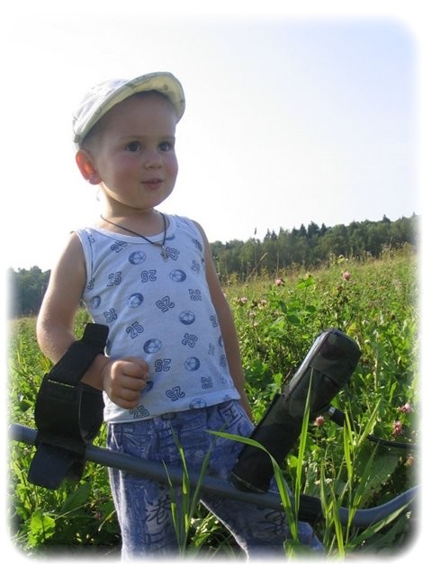 С каждым годом он активнее проявляет интерес к поиску. Он, это Никита, мой сын. Впервые на поиск он поехал в возрасте 4-х месяцев, недалеко, около 50 км от дома и я хорошо запомнил этот день, так как он был вознагражден среди прочих находок одной приятной - женским перстеньком 12 века, серебряным. Тогда, конечно, он не понимал и врят ли задумывался над происходящим, просто смотрел в поле, где бродил его отец и потом и вовсе уснул на руках матери. Спустя пару лет, как раз в прошлом году, взял его с собой опять же поблизости, скоротать вечерок на старом месте, когда-то подарившем клад пятаков. На находки особо не рассчитывали, но прибор всегда берется с собой уже из принципа. Однако, монетку и пряжку от упряжи все же найти удалось. Мелочь, но для ребенка такие безделушки представляют все же больший интерес, это своего рода сокровища.