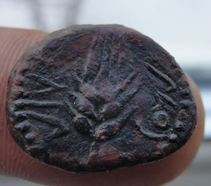 Буксую дня три с определением монеты, найденной на юго-западе Испании. Мне кажется похожей на римскую периода республики, исходя из портрета на аверсе. При этом легенда не на греческом и не на латыни. Поиск по "ячменю", "колосу" (на английском) ничего не дал. Требуются знания финикийского, языка иберов и ещё, Бог знает, какого. Для опознания выставлена также на одном из профильных порталов. 5,44 грамма, 20X17 мм. Медный сплав. Спасибо за внимание. Вложенные эскизы изображений |