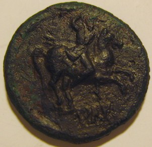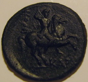 Диаметр составляет от 15 до 16 мм. Соотношение аверс/реверс - 180 градусов. На одной стороне изображена мужская голова в лавровом венке, смотрящая вправо, из букв по краю монеты можно разобрать следующее: "IOAN CA", далее неразборчиво (затёрто). На другой стороне виден конь с наездником, скачущий влево (наездник вскинул одну из рук перед собой), вокруг края монеты идёт надпись, из которой наверняка читаются только буквы "DVC", располагающиеся внизу, под ногами коня. |