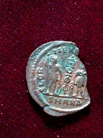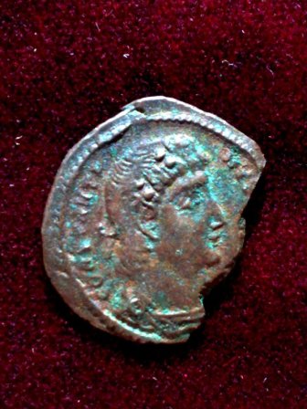 Предположу, что это Рим, "фоллис", 4 век н.э. (Константин Август ?).