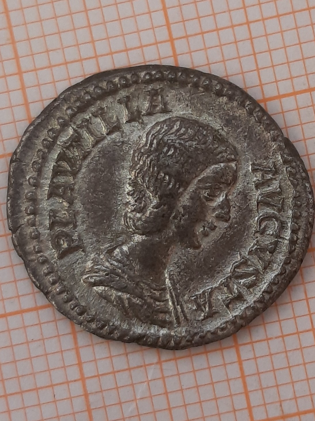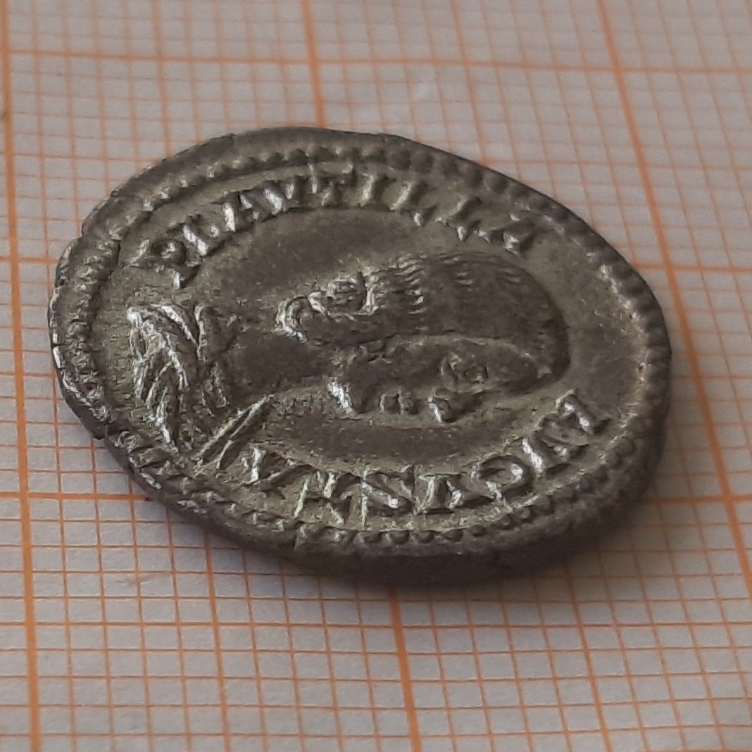 http://dirtyoldbooks.com/roman/id/plautil/plau003.jpg RIC 369 (Caracalla), S 7074, BMC 429 Denarius Obv: PLAVTILLAAVGVSTA - Draped bust right. Rev: VENVSVICTRIX - Venus standing left, leaning on shield, holding apple and cradling palm; Cupid to lower left. 202-205 (Rome). |