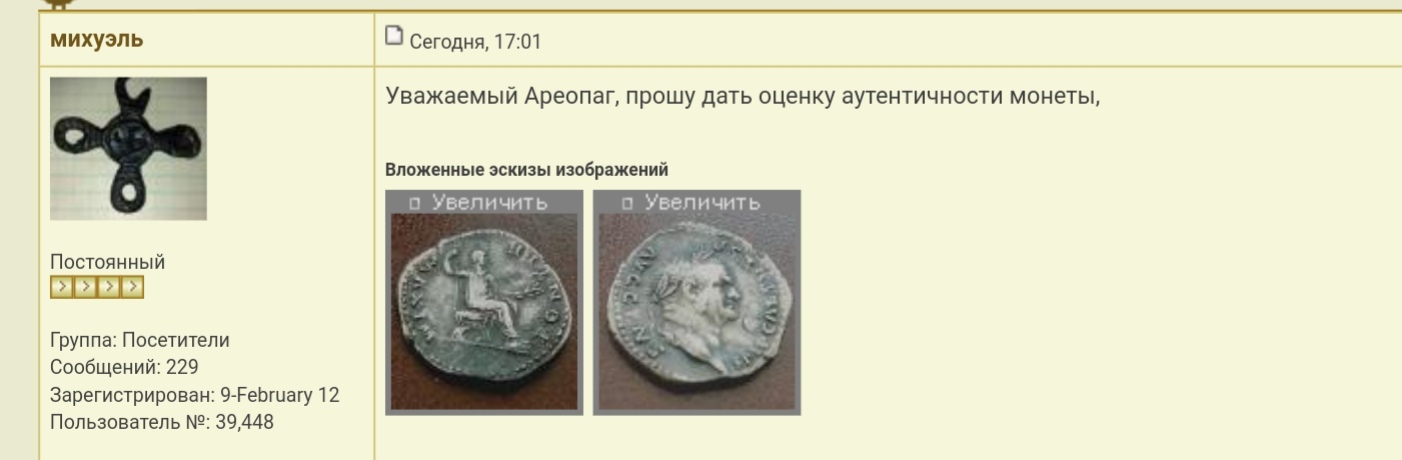 QUOTE(decide @ Feb 17 2022, 20:28) По Вашим фото подлинность не определяют. Нужны нормальные фото. Вообще состав у денариев в данном периоде может быть абсолютно разный. Но больше удивляет другое, как можно накидать почти 7000р. по фото михуэль ? Вот объясните мне. По таким фото можно пару соток дать и забыть. Нет фото ночью со шкафа и на тапочек почему то собирают массу желающих. Дополнительные Фото отсылались по почте, скан прилагаю, кто спрашивал тому отсылал, включая аппонента, в тексте лота так же была отсылка Сообщение отредактировано михуэль: Feb 17 2022, 22:13 Вложенные эскизы изображений |