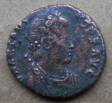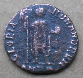 http://dirtyoldbooks.com/roman/id/arc/arc008.jpg RIC 68c (IX, Antiochia) AE2 Obv: DNARCADIVSPFAVG - Diademed (pearls), draped and cuirassed bust right. Rev: GLORIAROMANORVM Exe: ANT - Arcadius standing, facing, holding labarum and globe. 392-395 (Antioch). |