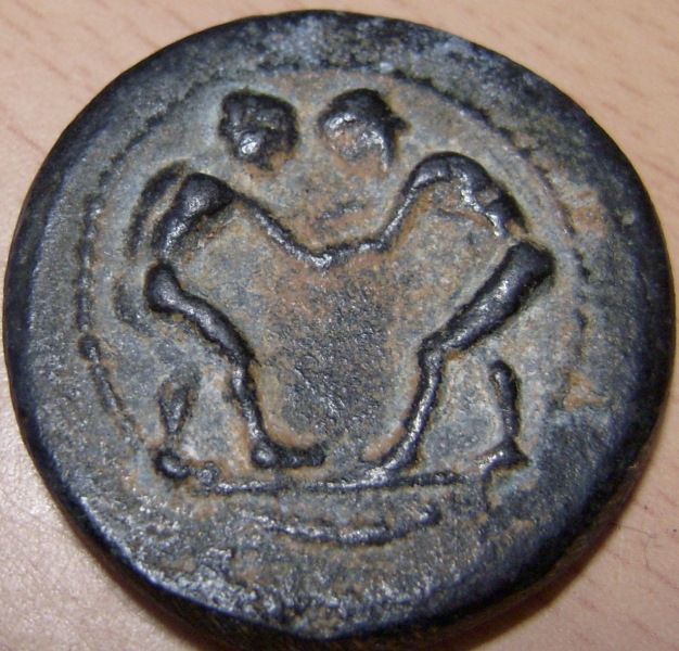 Много сувениров делают не как копии , а как фантазии . В данном случае сторона с квадригой ( колесницей ) , скорей всего , относится к Сицилии , Сиракузам . А сторона с атлетами , скорей всего , относится к малоазиатским городам - полисам . Поэтому дать ссылку не предоставляется возможным . |