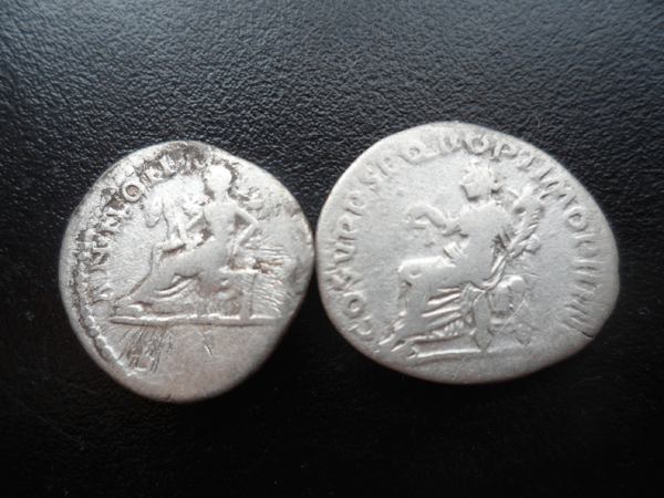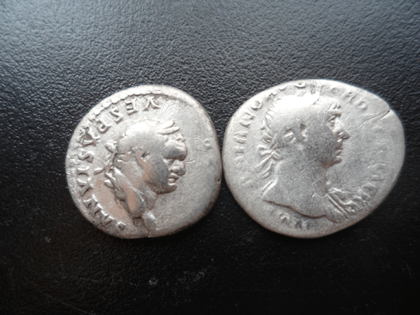 здравствуйте,подскажите по монетам, один похоже динарий Веспасиана,а 2й???? и сколько будут стоить примерно????