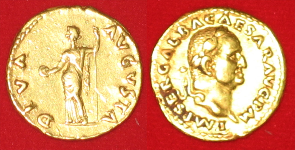Монета, предположительно аурес императора Гальба, вес 7,26, размер 19 мм, толщина от 0,9 до 1,1 мм.