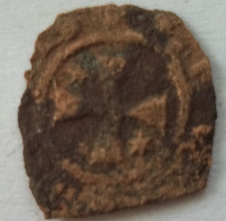 Аверс не рассмотреть, но наличие креста на реверсе свидетельствует от том, что у монеты или генуэзское или крестоносное происхождение. Если на аверсе св. Георгий на коне - фоллеро Кафа, если грифон - крестоносцы Кипра.