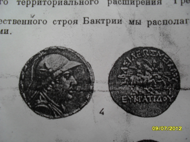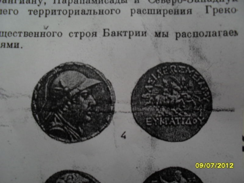 QUOTE(Алёша Попович @ May 25 2013, 19:54) Доброго времени суток.У знакомого есть вот такая монета, просил узнать её стоимость и соответсвенно атрибутировать.Спасибо. с ув Алексей. Монеты сначала атрибутируют , а затем оценивают . Оценить монету по изображению в книге невозможно . По изображению в книге - это тетрадрахма басилевса Бактрии Евкратида I , 171 - 145 гг. до н. э. или Евкратида II , 145 - 140 гг. до н. э. http://wildwinds.com/coins/greece/baktria/...atides_I/t.html http://wildwinds.com/coins/greece/baktria/...tides_II/t.html http://www.coinsoldes.ru/view_item.php?id=...at=16&dob_id=22 http://www.trajan.ru/eukratid.html |