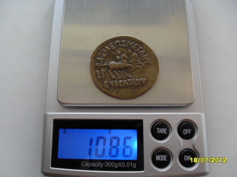 По какому каталогу Вы обсуждали эту монету ? По каталогу это должна быть тетрадрахма из серебра весом ~ 15 грамм басилевса Евкратида I .