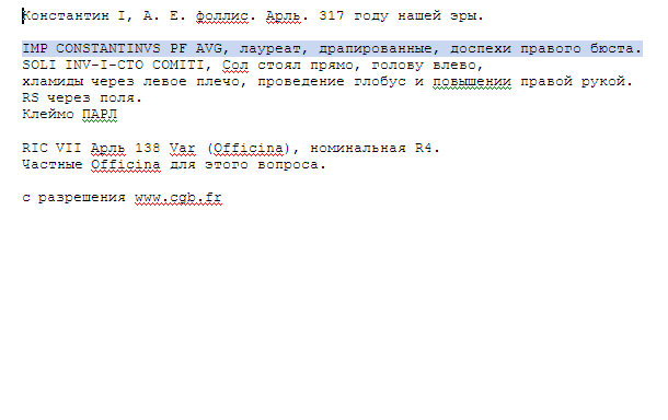 QUOTE(вершигора @ Nov 15 2013, 22:11) Нередкий фоллис имп . Константина I , ~ 313 - 318 гг . Мон . двор - Arles . Спасибо за ответ. Теперь понятно . Я думал что у меня буква "П" а оказывается " R ". И ещё вопрос , а что означает " R4"Реверс - бог солнца SOL с глобусом . http://wildwinds.com/coins/ric/constantine..._VII_138var.jpg http://wildwinds.com/coins/ric/constantine..._VII_138var.txt -------------------- Primus inter pares Не привык не перед кем унижаться , даже если это будет бегемот.