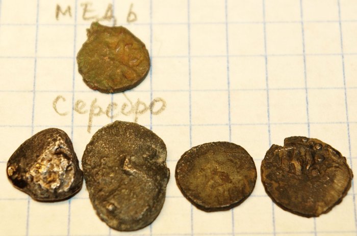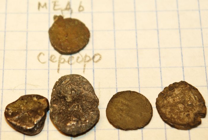 Уважаемые корифеи, недавно приобрел немного мелочи Пантикапеи. Среди понятных мне монет (датировка до 270 до н.э.) попались такие предметы. В наибольшей степени интересуют серебряные, в нижнем ряду две штуки справа. Масса 0,52 и 0,67 г. Думаю, что монеты, на тетартемории не похожи. Заранее благодарен. Вложенные эскизы изображений -------------------- Стоит статУя в лучах заката... Рюкзак, пинпойтер, прибор, лопата.