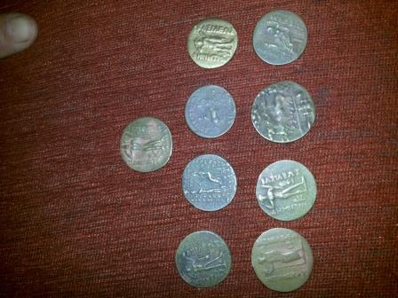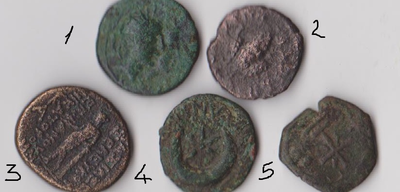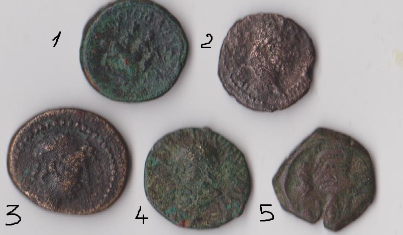 Прошу определить монеты.Прошу прощения но я совершеннейших дуб в антике и даже не знаю где посмотреть тип и сюжеты этих монет.Регион находки ориетировочно Ближний Восток.Сразу предупреждаю монеты не мои чистил не я.Особо интересует монета номер 2 в части сюжета с непонятными "початками кукурузы" на одной из сторон.Состояние монет не очень хорошее но я надеюсь что специалисты узнают характерные отличия и определят их.