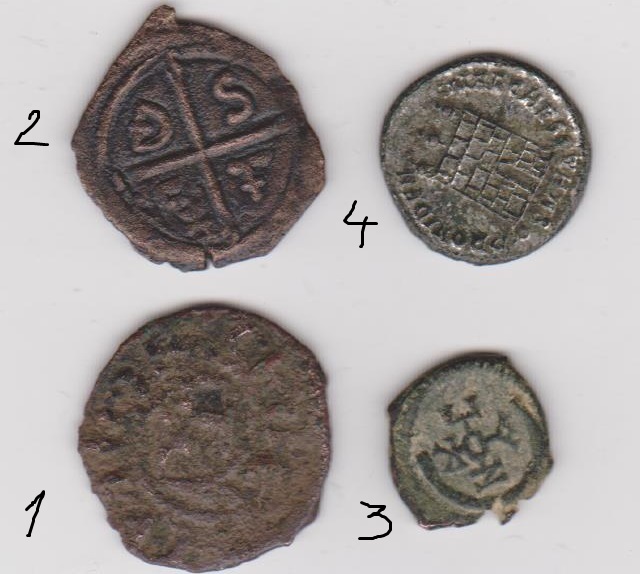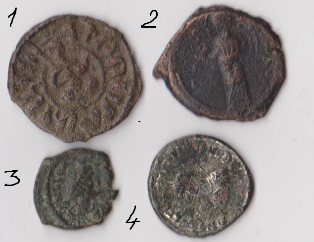 2) похоже на крестоносцев, посмотрю по каталогу 3) византийский пентануммий Юстиниана I 527-565 гг 4) позднеримская медь, возможно Константин 2 |