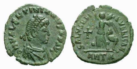 ГОСУДАРСТВА чеканили имп . Валентиниан I , Валент , Грациан и Валентиниан II с 364 по 392 гг . Судя по маленькой голове , у Вас бронза имп . Грациана или Валентиниана II . На реверсе - Виктория . http://wildwinds.com/coins/ric/valens/_aqu...RIC_009b_ii.jpg http://wildwinds.com/coins/ric/valens/_aqu...RIC_009b_ii.txt http://wildwinds.com/coins/ric/gratian/_aq...ia_RIC_018b.jpg http://wildwinds.com/coins/ric/gratian/_aq...ia_RIC_018b.txt |