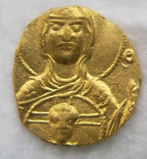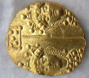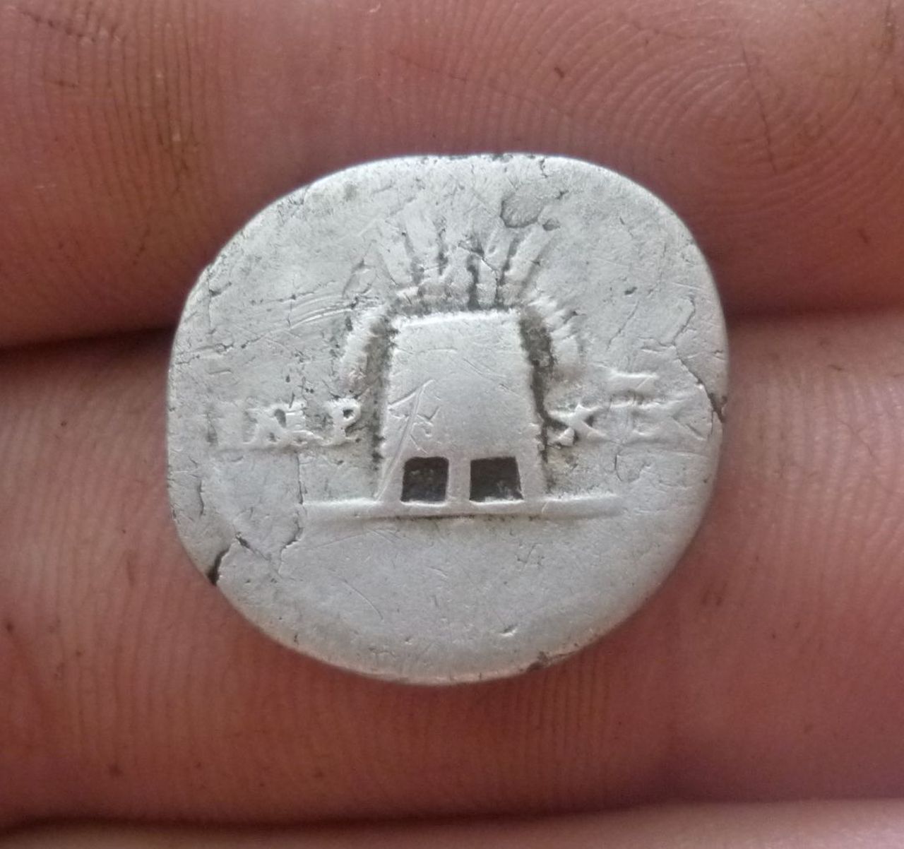 Добрый вечер. Сегодня попалась такая монетка. Похожа на РИМ, но не из серебра. Из какого метала не знаю. Если поможет, показания на приборе - рубль ходячка. Надписи не прочитать. В антике не силён.