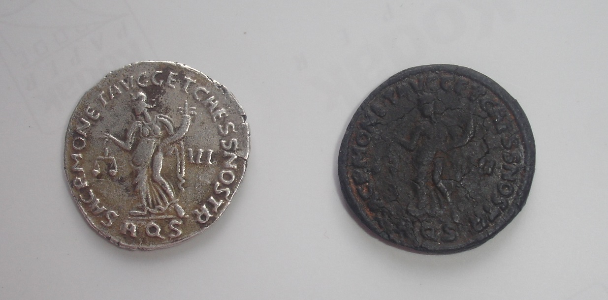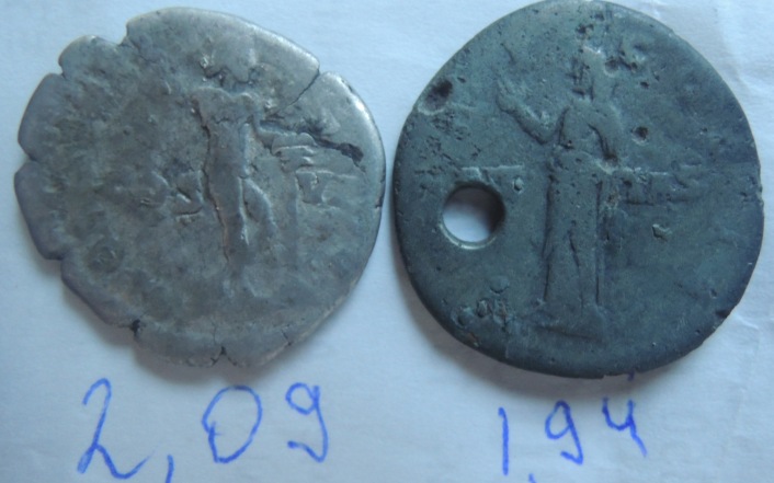 с абаком и рогом изобиля . Если монета не из серебра , то это подделка тех времен . http://wildwinds.com/coins/ric/marcus_aurelius/RIC_0206.jpg http://wildwinds.com/coins/ric/marcus_aurelius/RIC_0206.txt |