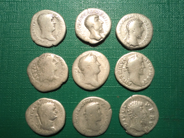 № 2 . Имп . Антонин Пий . № 3 . Посмертный денарий Фаустины II . № 4 . Имп . Веспасиан или Тит . http://www.dirtyoldcoins.com/roman/id/vespa/vespa106.jpg http://www.dirtyoldcoins.com/roman/id/titus/titus043.jpg № 5 . Посмертный денарий Антонина Пия . № 6 . Имп . Адриан . № 7 . Похоже на Антонина Пия . Надо четкое фото . № 8 . Посмертный денарий Марка Аврелия . № 9 . Посмертный денарий Адриана . Встречается реже . http://www.dirtyoldcoins.com/roman/id/had/had023.jpg |