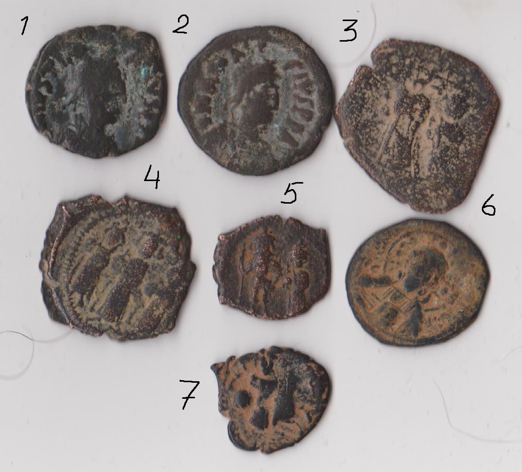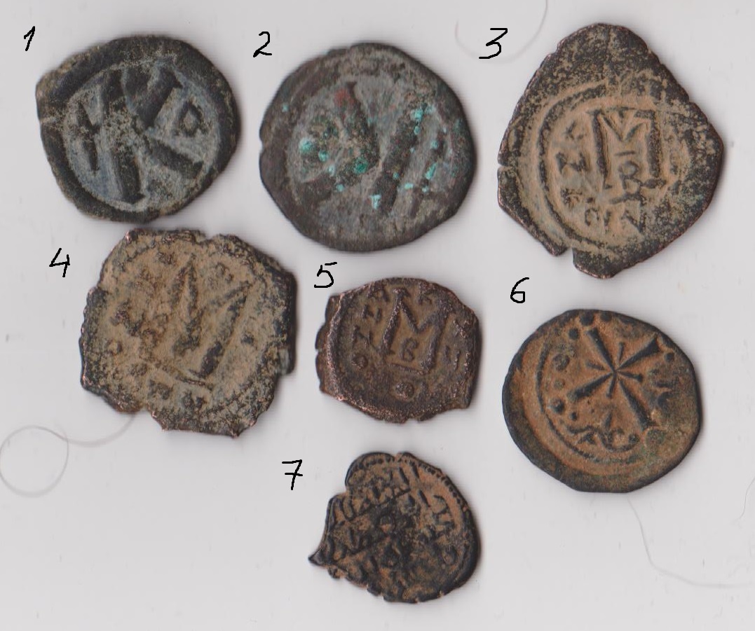 2. Полуфоллис Анастасия 1. 3 и 4. Фоллисы Ираклия. 5. Фоллис Констанса 2. 6. Анонимный фоллис, время Никифора 3 Вотаниата. 7. Арабо-византийский фоллис, 7 в. |