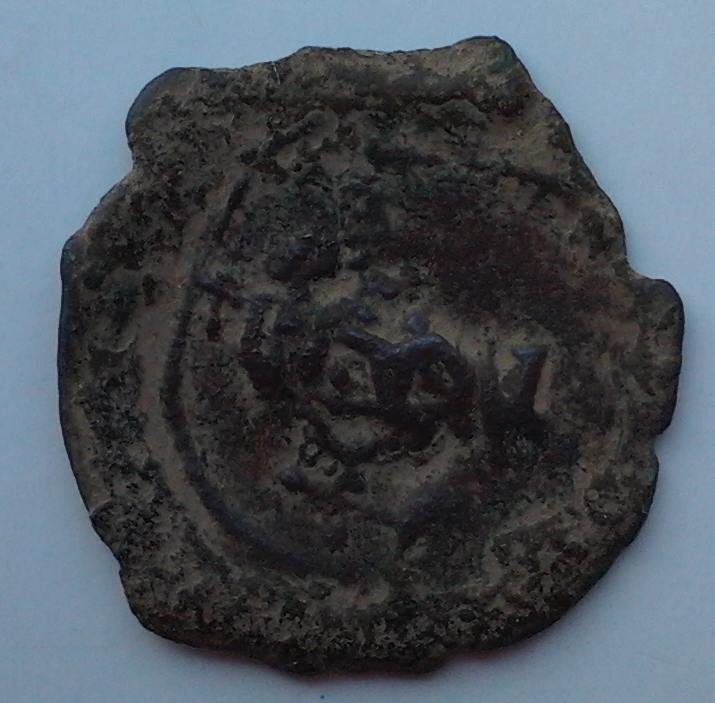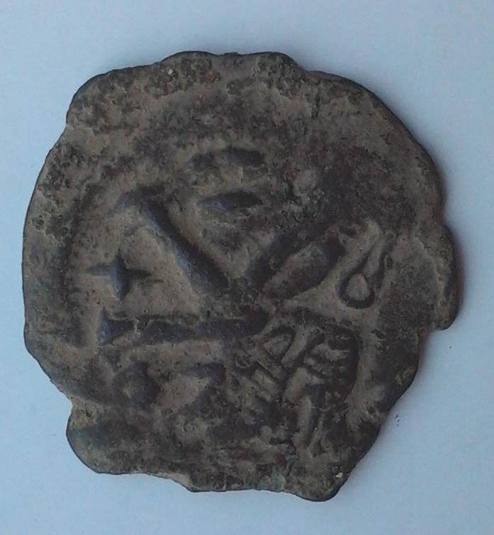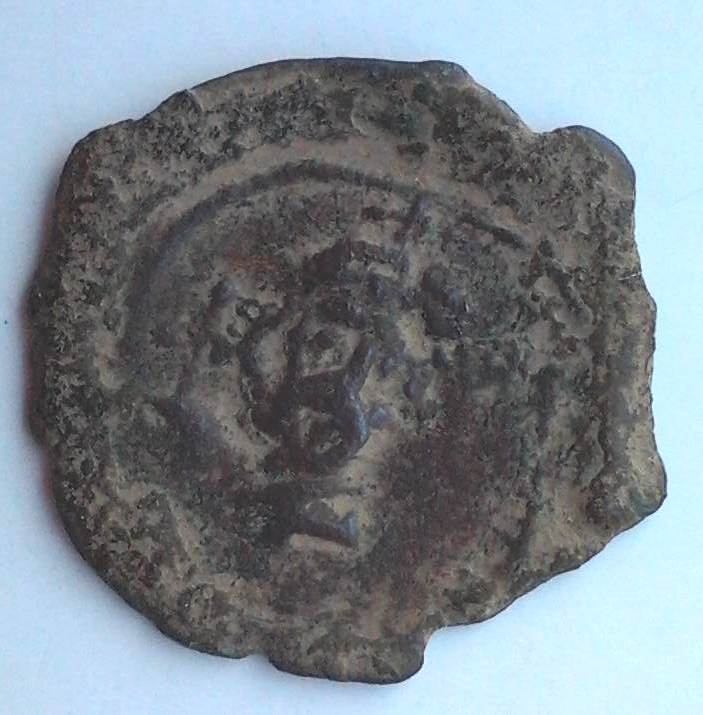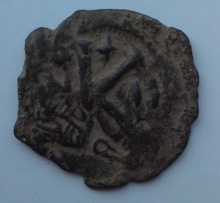 Полуфоллис Византии. Скорее всего, чей0то 2-й год правления. Такой перечекан, что аверса не разобрать. Предположу, что это Ираклий. |