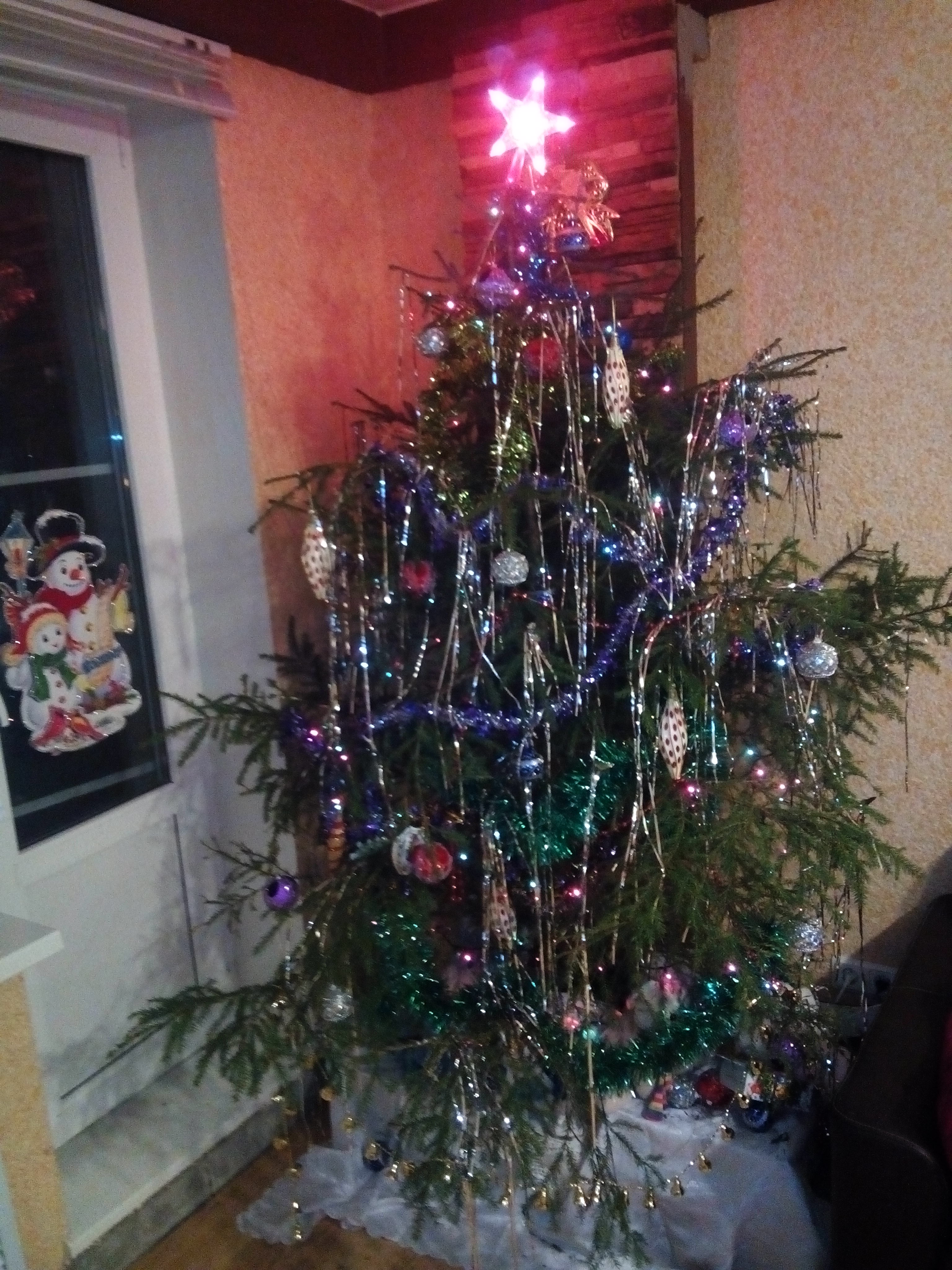 Мой ёлкин, игрушки все почти новые, но штучки три, плюс дед мороз и снегурочка ещё из моего детства.