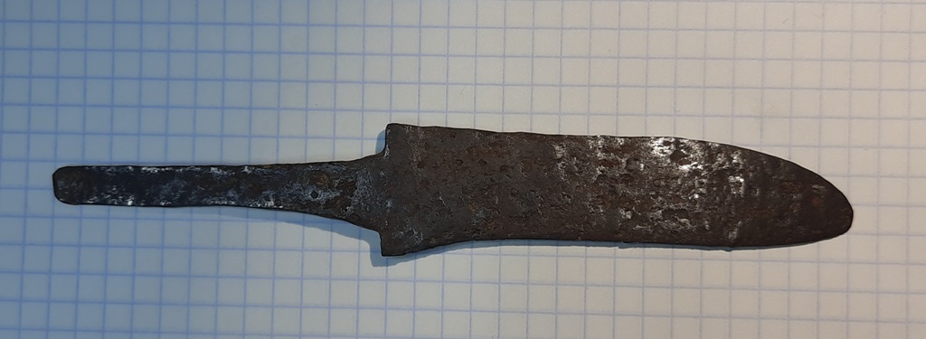 Смешной, курносый ножик предыдущего воскресения. Урочище. Все находки по времени от чешуи романовской до Павла. Крепкий, хоть сейчас используй.