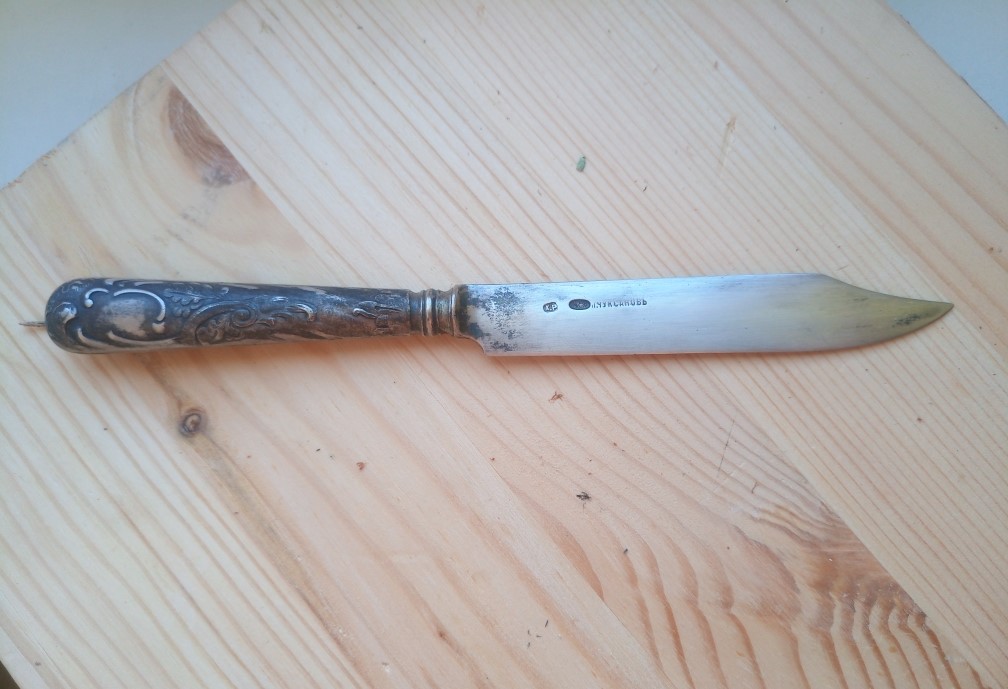 Вот такое чудо попалось в лесу, сначала хотел выкинуть сразу т.к. был весь в грязи и подумал, что обычный советский столовский ржавый нож, но решил перед этим товарищу показать, пока шел к нему руками лезвие чуть потер, а оно на удивление легко оттиралось до металла и явно не ржавого, дал товарищу, он и говорит: да походу это не черный металл, ну а потом и клейма проявились.