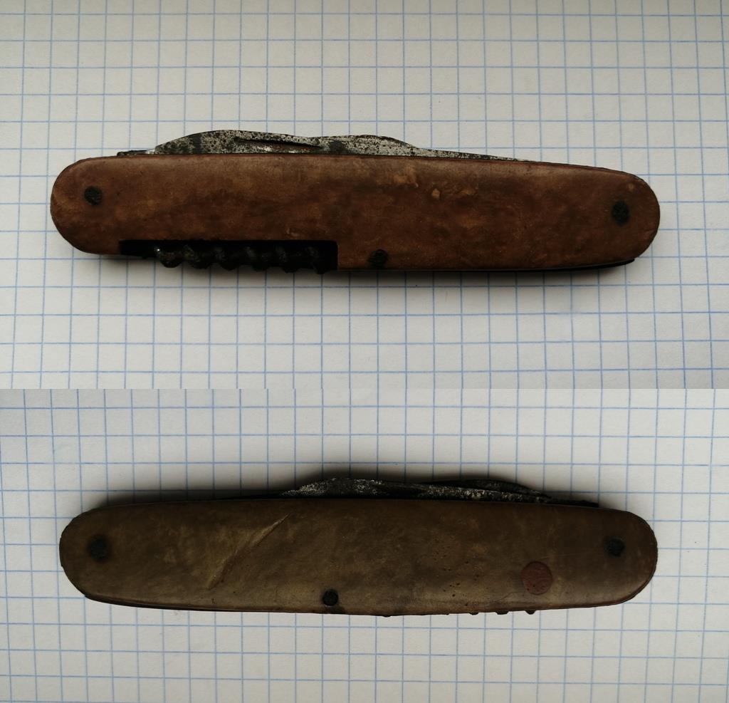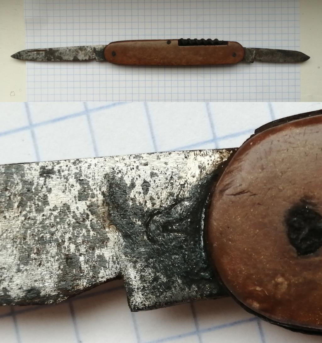 Камрады, подскажите по ножу плиз, это довоенный экземпляр или послевоенный? Найден на советских позициях, но не исключено, что грибник потерял. Только чекуха из инфо. На накладках надписей никаких нет. 3 предмета. Найден в сложеном виде, Залил ВДшкой на сутки. Открылся в натяг. Снял налет ржавчины бормашинкой. На ножи никогда не обращал внимания, но этот понравился и решил повозиться с ним чуток.
