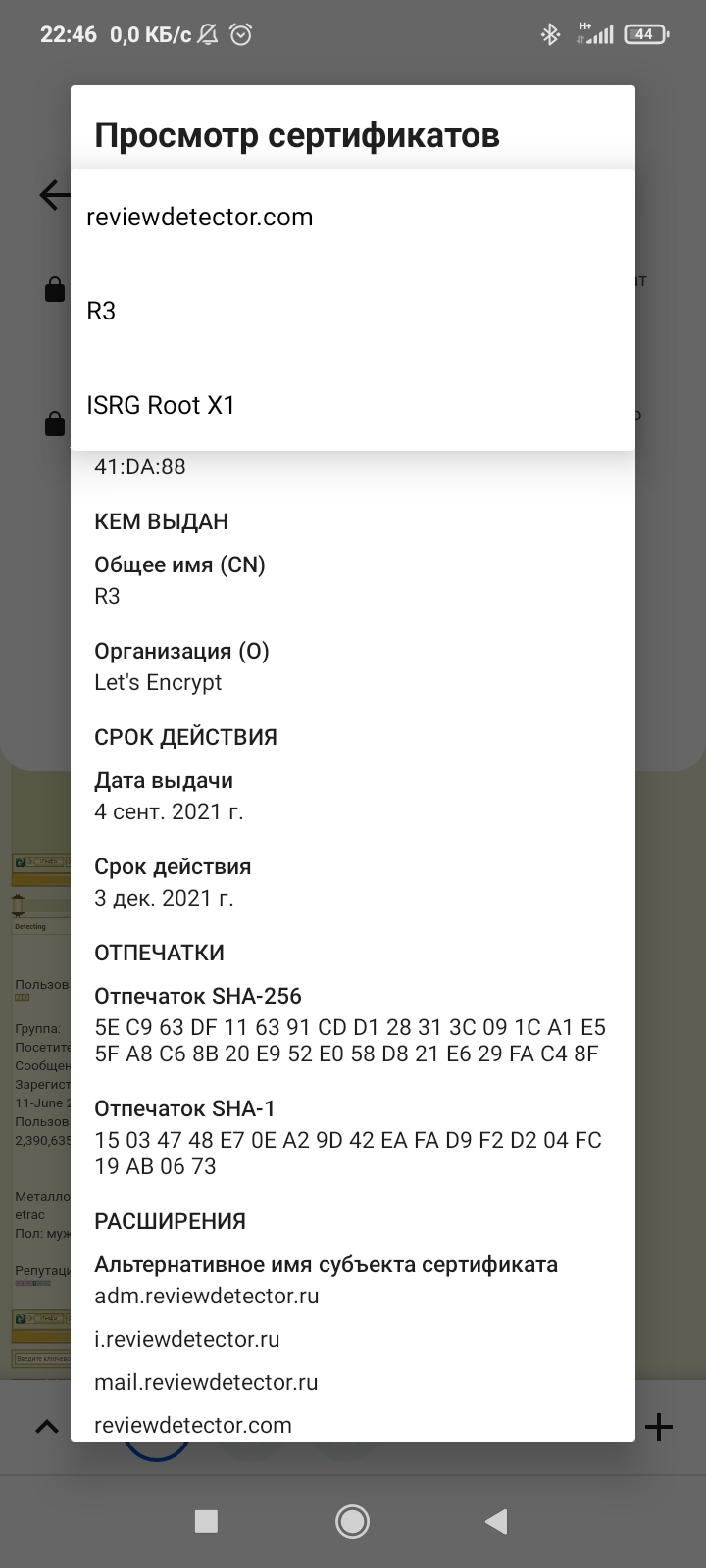 Сейчас снова включил у себя проверку сертификатов. Посмотрим. Если снова некоторые сайты не будут открываться, значит там опять устаревшие сертификаты числятся. Значит опять отключу эту проверку. Пока не будут везде новые сертификаты. [/quote] И вот сегодня опять ругается каспер на проверенные сайты. [quote=] Остановлен переход на недоверенный сайт Один или более сертификатов этого сайта недействительны, и мы не можем гарантировать его подлинность. Такое бывает, когда владелец сайта вовремя не обновил сертификат или когда сайт поддельный. Посещение таких сайтов делает вас более уязвимыми для атак. "Лаборатория Касперского" защитила вас от перехода на этот сайт. Можете закрыть его без риска. [/quote] Но сайты то проверенные, давным давно. И Ревьюдетектор проверенный, а открывается чёрно-белая страница. Не обычная, а на белом фоне чёрные буквы. Что делал в крайний раз? Правильно, включил в каспере проверку сертификатов. Значит опять отключаем эту проверку. Отключил снова, и всё стало нормально открываться. Можно конечно последовать советам лаборатории Касперского: https://support.kaspersky.ru/common/compati...KIS_21.2#block3 . Но как всегда - некогда возиться. И проверять: сработает или не сработает. Проще галочку снять с проверки сертификатов. Сообщение отредактировано Ohotnik_mur: Nov 3 2021, 11:49 -------------------- Мои МД и пин: X-Terra 705, Garrett ATX, Сфинкс 02