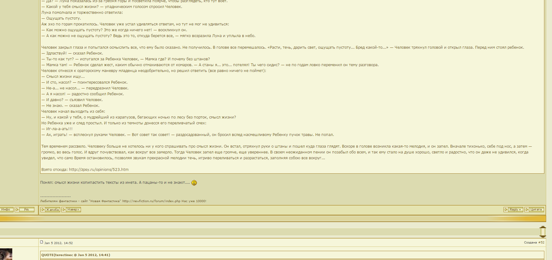 QUOTE(Mart @ Dec 14 2014, 15:53) Даниил Яковлев Однажды к Мастеру Вану пришли трое его детей, и каждый желал странного. ........... …С тех пор учение Свободной Личности в Поднебесной пошло на убыль, а учение Просветляющей Лопаты расцвело. О, страждущий Просветления! Стань на Путь Лопаты! И да будет тебе Нирвана (С) Замечательно! Если бы мог, плюсанул бы обязательно.. -------------------- в случае победы на аукционе напишите , пожалуйста , в личку...