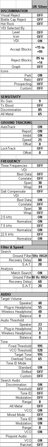 QUOTE(Sevast @ Aug 19 2009, 08:40) Хай про - самая нормальнная прога. Причем отличие её от других небольшое - уменьшение дискриминации и коррелэйт вместо бест дата. Когда у меня был Эксп II , дискрим стоял аналогичный, т.е. не полный, а открытый на 30 %. Это отсекает мелкое железо, которого много, но хватает кованину ( наконечники и подковы ) и крупное железо, которых не так уж и много. Гэйн и буст лучше выставлять после измерения минерализованности. Фильтр у меня 7.5 бэнд. Тоже пока привыкаю после Экспа. А в доме можно включать прогу Комон - это специально для демонстрации в помещении. В Hi Pro вроде как стоит Beast Data QUOTE И ещё один момент, не было времени разобраться, как отключить иконки цели, мешают, подскажите Заходишь в экспертное меню, находишь Discrimination detalet? затем идешь в Icons и Custom. -------------------- никогда не говори никогда