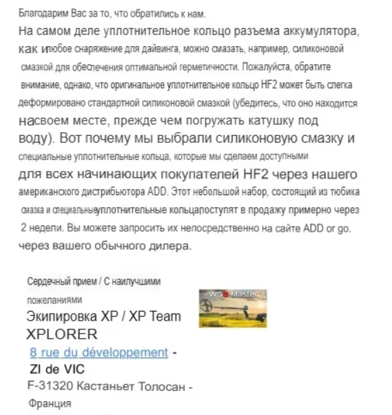 На зарубежном форуме была жалоба пользователя на протекание в воде новой катушки HF2 . Он связался с XP и получил ответ, что примерно через две недели ХР выпустят комплект уплотнительных колец с силиконовой смазкой...