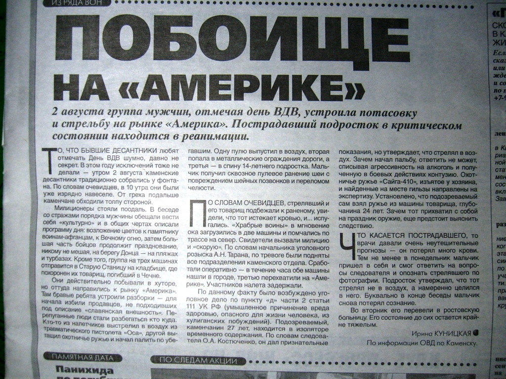 P.S. "Америка"- это название нашего продовольственного рынка за рекой Северский Донец. P.P.S. А, теперь взглянем на это всё с другой стороны. Представим, что "разрешённое" оружие было у ВСЕХ сторон. Неизвестно, ещё, чем бы всё это закончилось. И остались бы ли живы десантники. -------------------- Свобода от понтов - одна из самых сильных и ценных свобод.