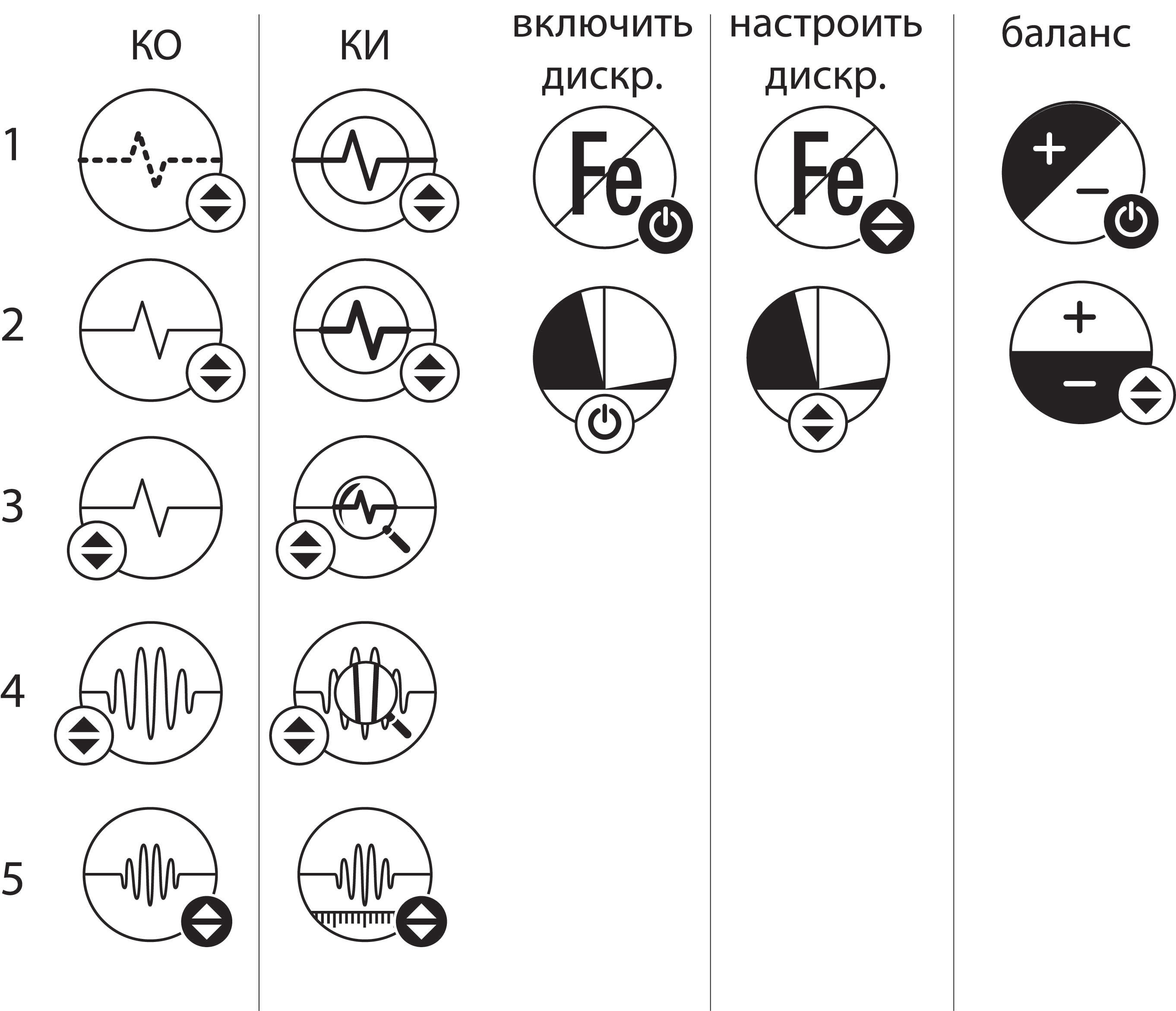 Господа копаки, дизайнеры и просто сочуствующие... Ваше мнение ? Вот такими привидились мне пиктограммки... Некая загогуля (КО) это долгожданный сигнал... Канал (КИ) эту загогулю измеряет с помощью линеечки или разглядывает с помощью лупы... И выдает вердикт.. "Копай!" Феррум-не феррум, включить - настроить ...это понятно... маленькие кружочки со стрелочками, означают, что параметр настраеваемый... а не вкл/выкл.... Баланс-плагиат с баланса белого в фоторемесле.... ну.. программы и меню - все просто...