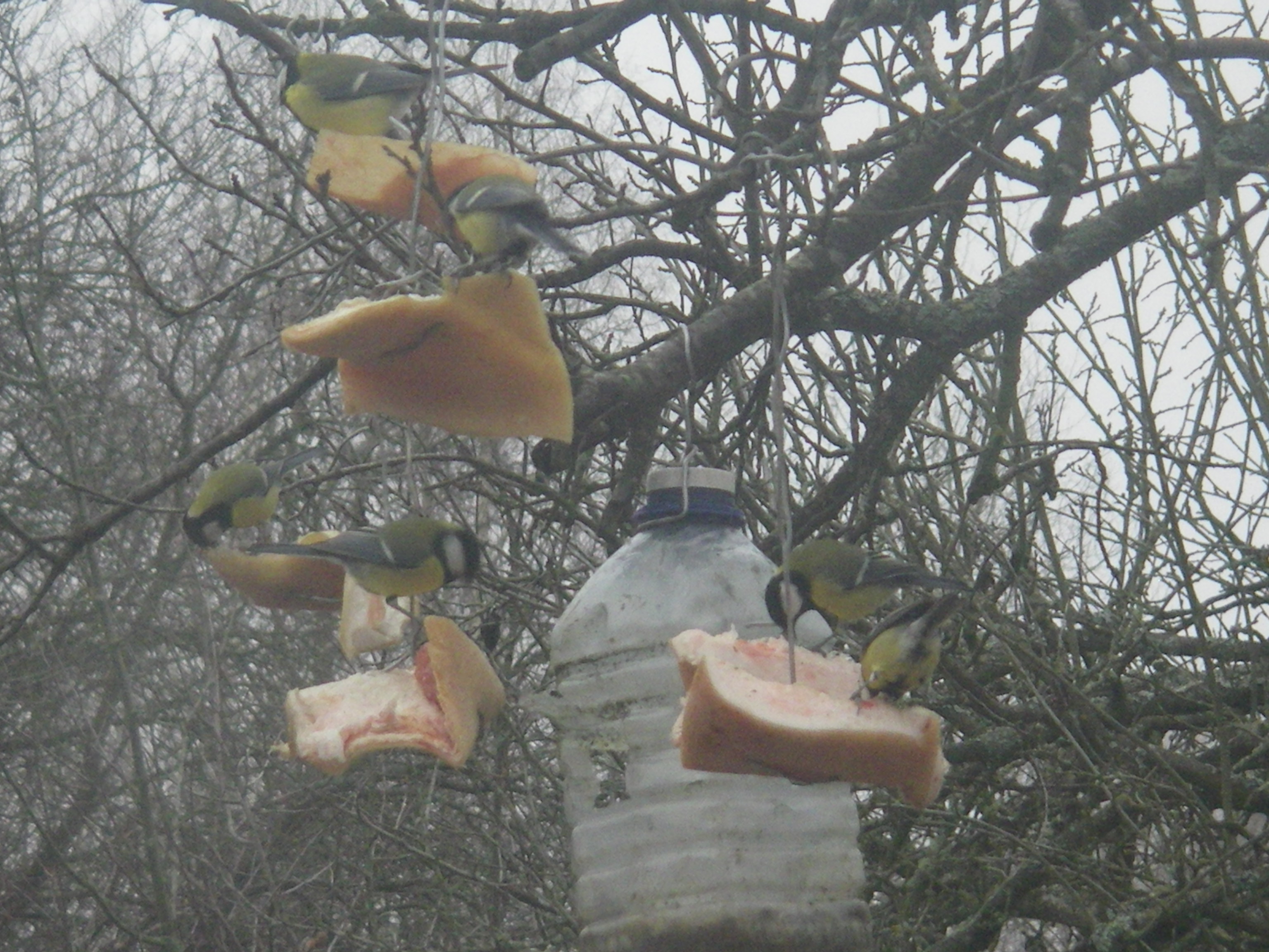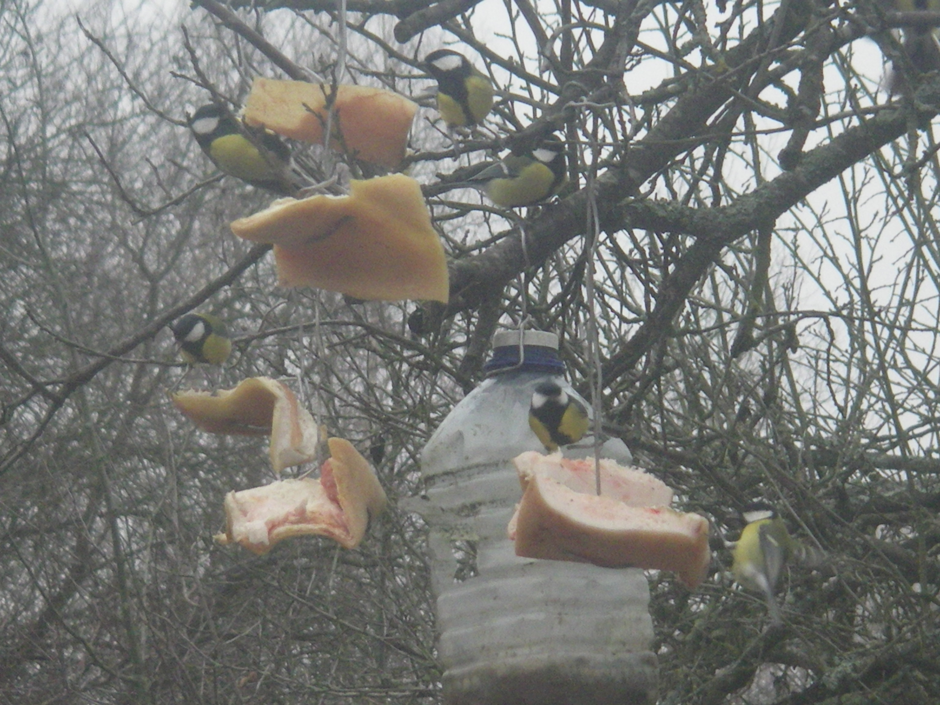 Несколько дней назад подготовил сальца 1,5кг, разделил на 6 кусков и нанизал на проволоке. Мож на пару-тройку недель хватит, ибо не только синицы им подъедаются, но и дятлы с поползнями. Помимо сала в кормушке угощение в виде семок. Убывают быстро, хоть и насыпаю аж до летков, поэтому наполнять кормуху приходится каждые 3-4 дня. А это сами постояльцы. Несмотря на то, что каждой пичуге по куску достаётся - всё равно дерутся между собой постоянно. -------------------- Ишь ты...