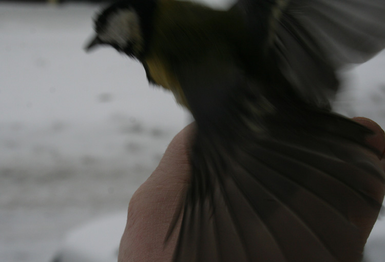 Ура, потеплело - и с чистой совестью в свободный полет отправил отожравшегося и подлеченного бывшего "одноглазика". Благодарная птичка, истрепавшая несколько книжек, изрядно напукавшая по углам, на прощанье клюнула в палец и с воплем "Пинь-тарарах!" усвистела... куда бы вы думали? В кормушку! Я этому хмыренку на лапку колечко одел, аллюминевое (которым орнитологи кольцуют) - теперь я его враз признаю..